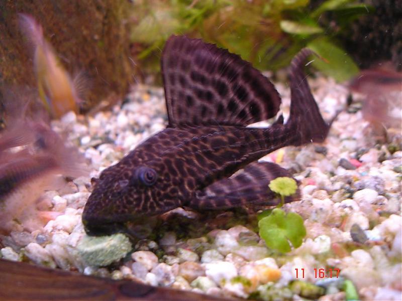 Κατάφερα να πιάσω τον κύριο Λεοπαρδάλις και να τον απομακρύνω από τους Δίσκους.ΟΥΦ Τελικά αποδείχτικε πιο δύσκολο από οτι φανταζόμουν. Οποτε άνοιγα το καπάκι του ενυδρείου εξαφανιζόταν.Ούτε με την τροφή δεν έβγαινε. Εκοψα λοιπόν ένα μπουκάλι νερού και το αφησα μέσα τρείς ημέρες με το καπάκι ανοιχτό γιά να συνηθίση.Πάλι τίποτα και ας έβαζα την τροφή μέσα σε αυτό. Εβλεπα όλα τα άλλα εκτώς από αυτόν.Μέχρι και οι Δίσκοι έμπαιναν. Σκέφτικα μήπως έπρεπε να βάλω ένα μη διάφανο μπουκάλι αλλά σήμερα βγήκε βόλτα έβαλα την απόχη μέσα και .......μπήκε μόνος του μέσα σε αυτήν. Τόσος κόπος πατέντες και αυτός μας κορόιδεψε. Ευτυχώς απομακρίνθηκε - είχε γίνει αρκετά επιθετικός στους Δίσκους και τα άλλα μικρά.