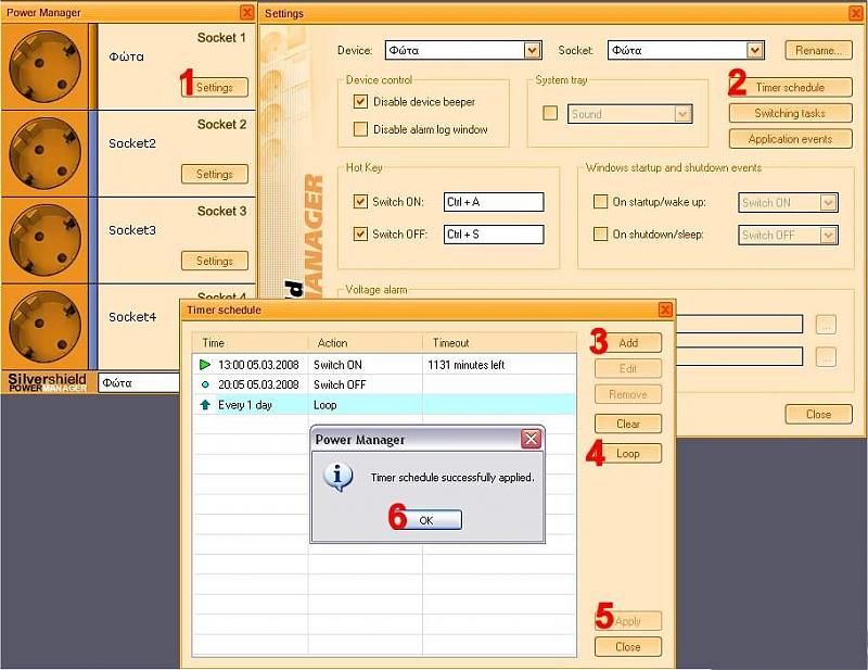 κανεις κλικ στο νουμερο 1 (η στην αντιστοιχη πριζα που εχεις συνδεσει την συσκευη που θες να ρυθμισεις, εγω εχω τα φωτα μου τα εχω στην πριζα 1) κλικ στο νουμερο 2 οπου θα σου ανοιξει το time schedule εκει κανεις κλικ στο νουμερο 3 οπου εισαγεις την ωρα που θες να αναψουν τα φωτα σου ξανακανεις κλικ στο νουμερο 3 για να βαλεις την ωρα που θες να κλεινουν (θα προσεξεις οτι θα πρεπει να βαλεις ημερομηνια και ωρα στο μελλον αλλιως θα σου βγαλει λαθος, με αλλα λογια ξεκινησε και κανε τις ρυθμισεις σου με αυριανες ημερομηνιες) μετα κλικ στο νουμερο 4 για να ρυθμισεις την επαναληψη καθε μια ημερα και μετα κλικ στο Apply θα πρεπει να σου βγαλει το παραθυρο που βλεπεις και αφου κανεις οκ και close σε ολα ειναι οκ παρατηρησε οτι μπορεις να βαλεις στο Hot Key οποιο συνδιασμο θες για να εχεις χειροκινητο ελεγχο στις συσκευες σου, διαφορετικο συνδιασμο για να ανοιξουν και διαφορετικο για να κλεινουν ΤΕΛΟΣ ΘΑ ΗΘΕΛΑ ΝΑ ΣΟΥ ΠΩ ΟΤΙ ΠΑΡΟΛΟ ΠΟΥ ΠΡΟΣΠΑΘΗΣΑ ΝΑ ΜΗΝ ΚΑΝΩ ΚΑΝΕΝΑ ΛΑΘΟΣ ΜΠΟΡΕΙ ΝΑ ΥΠΑΡΧΕΙ ΚΑΠΟΙΟ ΣΦΑΛΜΑ, ΕΙΝΑΙ ΠΕΡΙΤΟ ΝΑ ΠΩ ΟΤΙ ΕΙΝΑΙ ΔΙΚΙΑ ΣΟΥ ΕΥΘΥΝΗ ΝΑ ΤΟ ΕΛΕΓΞΕΙΣ ΓΙΑ ΑΡΚΕΤΟ ΔΙΑΣΤΗΜΑ ΜΕΧΡΙ ΝΑ ΣΙΓΟΥΡΕΥΤΕΙΣ ΟΤΙ ΕΙΝΑΙ ΕΤΣΙ ΟΠΩΣ ΤΟ ΘΕΛΕΙΣ |