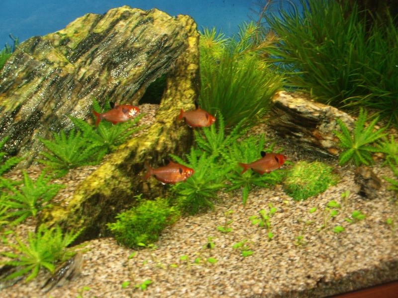 Κάτι που θα άλλαζα εγώ είναι κάποιες μικρές μετακινήσεις στις πέτρες.. Συγκεκριμένα, θα αύξανα λίγο την κλίση στην τέρμα αριστερά και στην τέρμα δεξιά, να γίνουν λίγο πιο κατακόρυφες.. Επίσης, την τέρμα αριστερά θα την μετακινούσα ελάχιστα δεξιότερα.. Και τέλος, θα μετακινούσα και λίγο την δεύτερη από αριστερά, λίγο προς τα δεξιά, και με τρόπο ώστε να δημιουργεί μία ευθεία παράλληλη προς την κεντρική μεγάλη πέτρα.. Με τον τρόπο αυτό, σχηματίζονται 2 νοητά τρίγωνα, ένα "ανάποδο" αριστερά, και ένα "όρθιο" δεξιά, με τις κορυφές του καθενός να βρίσκονται σε σημεία χρυσών τομών.. Είναι ένας γενικός "οπτικός" κανόνας που ακολουθούν γενικά τα τύπου Iwagumi, ειδικά για όσους τους αρέσουνε τα μαθηματικά και οι γεωμετρίες (που άλλωστε τις συναντάμε και στη φύση).. Και άλλο ένα θεματάκι (που δεν έχω ξεκαθαρίσει ακόμη αν έχει ή δεν έχει νόημα τελικά), είναι ότι στα περισσότερα Iwagumi χρησιμοποιούν μονό αριθμό βράχων.. Και εσύ έχεις τέσσερις (δηλαδή ζυγό αριθμό).. Βασικά, 5 πρέπει να έχεις αν διακρίνω καλά, αλλά οι 2 είναι ακουμπισμένες μεταξύ τους και φαίνονται σαν ένας όγκος.. Εγώ, στη θέση σου, μάλλον θα το δοκίμαζα, να τις "ξεχωρίσω" λίγο.. Δε λέω για μεγάλες μετακινήσεις, αναφέρομαι σε λίγα μόνο εκατοστά, καθώς το αποτέλεσμα είναι ήδη πάρα πολύ όμορφο, και αφήνει λοιπόν περιθώρια να ασχοληθεί κανείς με τις παραμικρές λεπτομέρειες.. Μπράβο και πάλι!