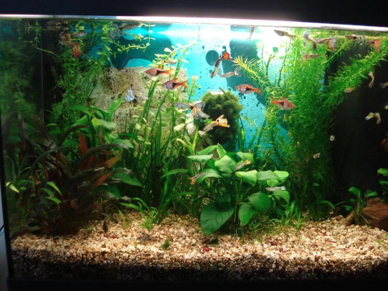 Διαστάσεις: 80Χ30Χ40εκ. AQUARAMA 80 της RENA Όγκος: 74lt περίπου Κατηγορία: Κοινωνικό Φυτεμένο Φυτά: Anubias barteri Vallisneria spiralis Cabomba caroliniana Cladophora aegagrophila(δεμένο πάνω στις ρίζες) Christmass moss Microsorium Pteropus egeria densa Cryptocoryne wendtii (Brown) Ludwigia repensrubin Lilaleopsis novae-zelandiae Rotala rotundifolia Ψάρια / ¶λλα είδη: Poecilia reticulata GUPPY 10 μόνο αρσεν.(ζητούνται ανάδοχοι γονείς) Pterygoplichthys pardalis (ψάχνω για ανάδοχο, που να ξερα πέρυσι που τον πήρα ??? και μετά μπήκα στο φόρουμ, έφτασε αισίως τα 20 εκ και βλέπουμε... μάλλον θα πάει δωρεά στο Madrid Aquarium)4 Αρλεκίνους (Trigonostigma Rasbora) (μόνο αυτοί θα μείνουν) 3 Corrydoras Paleatus Μόλις φύγουν τα παραπάνω σκέφτομαι να προσθέσω μερικά Zembra danio ή κάποιο άλλο είδος danio. Τι μου προτείνεται ??? Διακοσμητικά υλικά: χαλίκι ελαφρύ (πορόλιθος), Ρίζα μοπάνι και Magrov Φόντο: Αφίσα βυθού Φωτισμός: 1 18W T8 Solar Tropic JBL + 2 T4 12W Διάρκεια φωτισμού: 10 ώρες Φιλτράρισμα: Εσωτερικό βιολογικό κ μηχανικό με μπλέ κ πράσινο σφουγγάρι, υαλοβάμβακα και βιολογικό υλικό της JBL. Θερμοστάτης: της εταιρείας JAGER Eheim 75W Λίπανση:Plantamin/TETRA, κάθε 15 ημέρες 20 ml + Flourish Excel 10 ml/ 7 μέρες Παροχή CO2: φιάλη BioCO2 της JBL διασκεβασμένη σε DIY Περιμένω εναγωνίως τα σχόλιά σας, καθώς και τον Halvas69, να μου πει αν μπήκε λίγο τάξη τώρα. Χαιρεστιμούς από Μαδρίτη. Φτάσαμε τους τρεις τώρα, πάμε για παράρτημα του ΠΣΦΕ σιγά -σιγά...