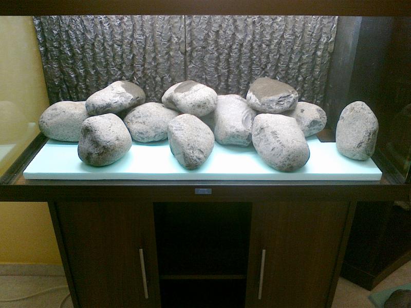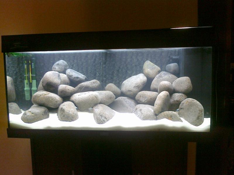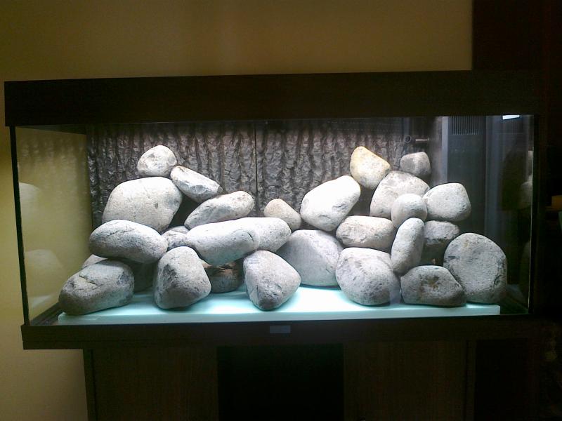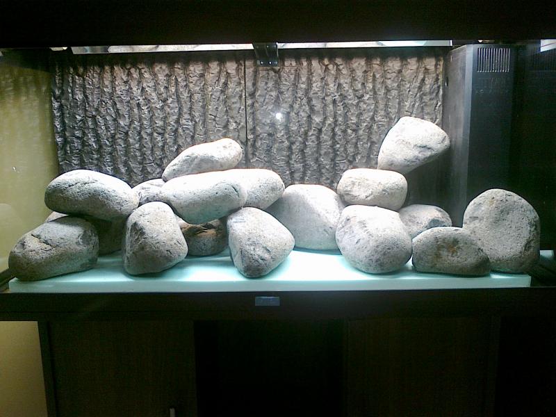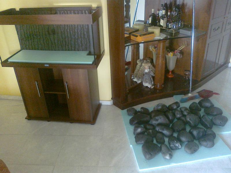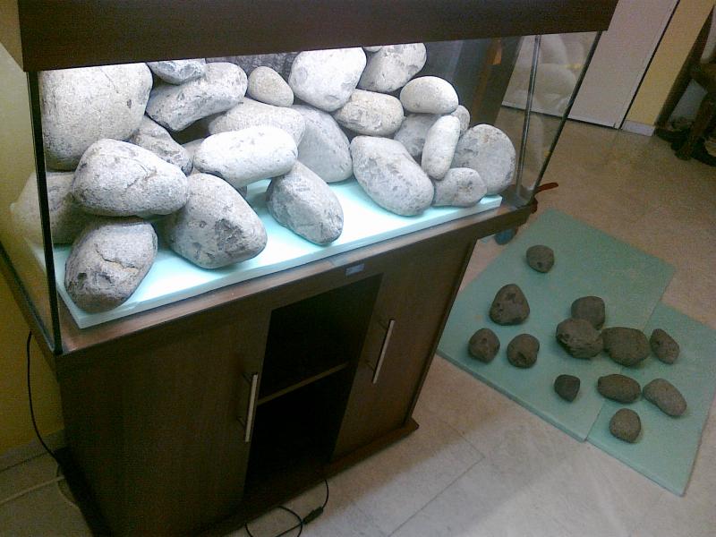 1)Το ενυδρείο,αφού πλύθηκε σχολαστικά,χαιρέτησε την προηγούμενη ζωή του ως φυτεμένο και στήθηκε με έναν έλεγχο για τυχόν φθορές είτε στο ενυδρείο είτε στο έπιπλο που θα μπορούσαν να προκαλέσουν αργότερα πρόβλημα. 2)Για να γίνει πιο εύκολη η επιλογή της πέτρας για το κάθε σημείο,όλες οι πετρούλες μεταφέρθηκαν δίπλα στο ενυδρείο.Ήταν όλες 90 κιλά συνολικά.Δε χρησιμοποιήθηκαν όλες. 3)Τοποθετήθηκε φειλιζόλ για να πατήσουν οι πέτρες πάνω. 4)Μπήκαν οι πρώτες πέτρες.Σχεδόν όλες όσες πάτησαν πάνω σε αυτές τις πρώτες,κολλήθηκαν με σιλικόνη της Bison κατάλληλη για τζάμια ενυδρείου. 5+6)Κάθε πέτρα έμπαινε μέσα μετά από πολύ σκέψη και προσοχή.Το στήσιμο διήρκεσε αρκετό καιρό,καθώς μαζευόμασταν το βράδυ παρέα και κάναμε πλακίτσα στήνοντας παράλληλα και το ενυδρείο.Ωραία πράγματα και μια διαφορετική πλευρά του χόμπι.Για τα χαρτιά,το στήσιμο του ενυδρείου (δε μιλώ για ψάρια.αυτό έγινε πολύ αργότερα) διήρκεσε από τις 14-08 μέχρι τις 08-09 και αποκλειστικά σε μεταμεσονύκτιο πρόγραμμα με πλωμάρια και τα λοιπά.Αυτό είναι χόμπι. 7+8 )Το στήσιμο μετά την ολοκληρωσή του και οι πετρούλες που περίσσεψαν. 9)Το ενυδρείο μετά το πρώτο γέμισμα. 10)Ο,τι περίσσεψε από το στήσιμο.