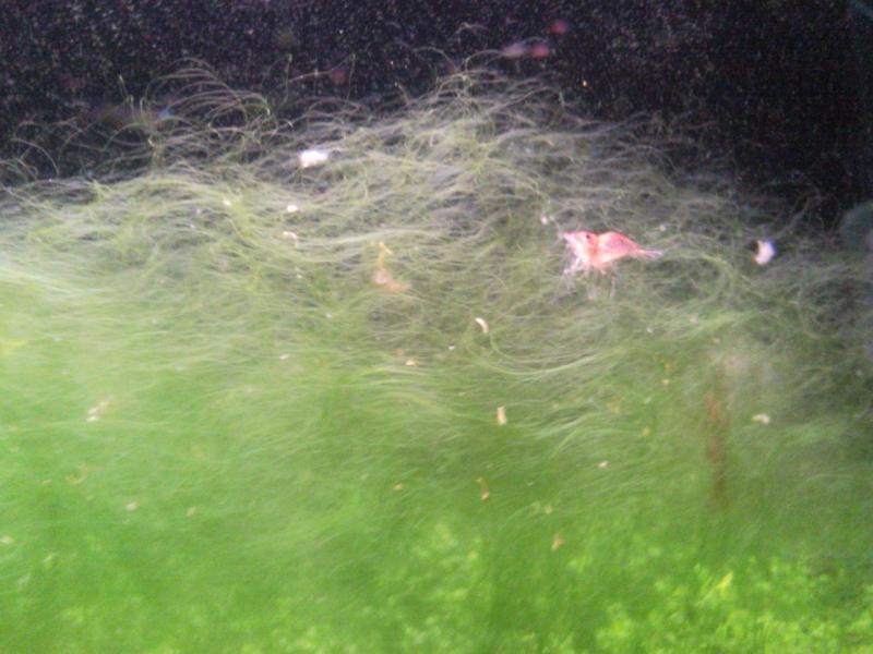 Σβήσε τα φώτα και ρίξε 3-4 ΣΑΕ για μερικές μέρες(τις γαρίδες αν μπορείς βγάλτες,ειδάλλως ξέχνα τες με τα ΣΑΕ μέσα).Ρίξε και λίγο αγιασμό.¶τιμη άλγη αυτή.Όση μπορείς απομάκρυνε με το χέρι η κούρεψέ την με ψαλίδι...