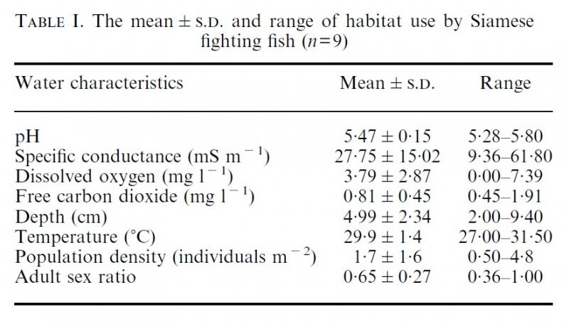 Βρήκα ένα άρθρο που περιγράφει τα χαρακτηριστικά ενός συστήματος μονομάχων στην Ταυλάνδη κατά την αναπαραγωγική περίοδο. Jaroensutasinee, M. and Jaroensutansinee, K. (2001), Bubble nest habitat characteristics of wild Siamese fighting fish. Journal of Fish Biology, 58: 1311–1319. doi: 10.1111/j.1095-8649.2001.tb02288.x Abstract: Siamese fighting fish Betta splendens in Thailand inhabit shallow water amongst dense emergent vegetation near the margin of rice paddy fields. Nesting water was low in dissolved oxygen, pH, salinity but high in free carbon dioxide and temperature. This fish aggregated with a mean population density of 1·7 fish m-2 and an equal adult sex ratio. Males were heavier, longer and wider than females. The size of their bubble nest is in proportion to their weight and length. Δεν μπορώ να δώσω ολόκληρο το άρθρο γιατί δεν είναι Open Access. Ενδιαφέρον έχει το παρακάτω πινακάκι που δίνει τα χαρακτηριστικά του νερού κατά τη δειγματοληψία: |