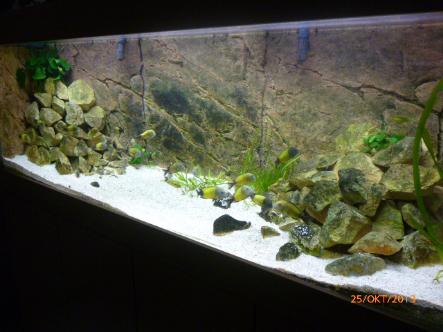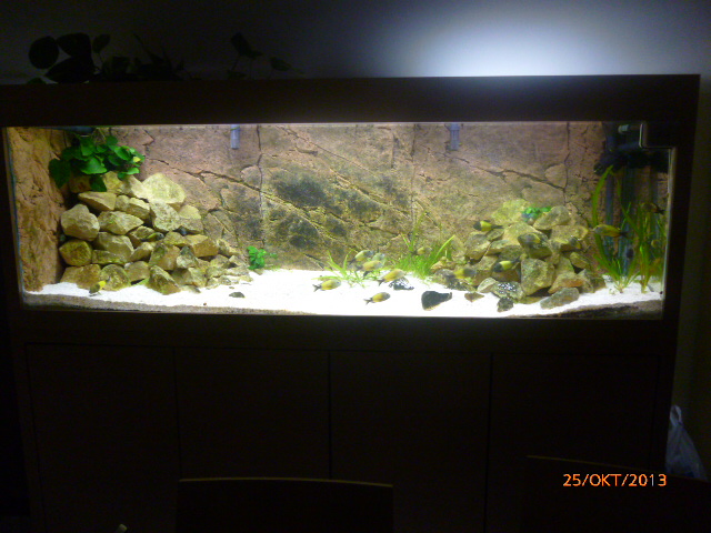 Η αλήθεια είναι πως στο προηγούμενο ενυδρείο όλα ήταν σκούρα , πέτρες-φόντο κι έχαναν από το χρωματισμό τους.Τώρα στο νέο δεν ξέρω πως θα φαίνονται όταν πιάσει η άλγη.