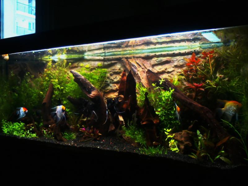 Αυτό είναι το μεγαλύτερο ενυδρείο μου. Πρόκειται για το γνωστό RIO 400. Και σε αυτό το ενυδρείο έγιναν κάποιες βελτιώσεις. Αφαίρεσα τις εργοστασιακές κόντρες ενώ πρόσθεσα καινούριες στον πάτο του ενυδρείου περιμετρικά αλλά και στο πάνω μέρος. Τοποθέτησα μία DIY 3d πλάτη και έκρυψα σε αυτήν θερμοστάτες σωλήνες κτλ. Επίσης αντικατέστησα το εργοστασιακό καπάκι με ένα αλουμινένιο δική μου κατασκευής. Σε αυτό τοποθετήθηκαν όλα τα ηλεκτρολογικά καθώς και ο ελεγκτής της θερμοκρασίας με τους ανεμιστήρες του. Το ενυδρείο τρέχει αρκετό καιρό περίπου επτά μήνες και η φωτογραφίες του είναι από την αρχή που το ξεκίνησα μέχρι και σήμερα. Τηρείται καθημερινό πρόγραμμα λίπανσης και υπάρχει παροχή διοξειδίου του άνθρακα ελεγχόμενο με ηλεκτρομαγνητική βαλβίδα με εντολή από τα φώτα. Διαστάσεις Ενυδρείου (ΜxΠxΥ): 150X 50Χ 66 υψος Συνολικά Λίτρα: 450 Φυτά: Μπορεί να έχω ξεχάσει μερικά • Alternanthera rubra • Alternanthera splendens • ammannia gracilis red • Bacopa caroliniana • Bacopa lanigera • bacopa monnieri • ceratophyllum demersum • Ceratopteris Thalictroides • Cryptocoryne wentii brown - green • Cabomba piauhyensis • Echinodorus Rubin narrow leaf • Egeria densa • Heteranthera zosterifolia • Hydrocotayle sp japan • hygrophila corymbosa siamensis • hygrophila difformis • Hygrophila polysperma • Lagarosiphon madagascarensis • Limnofila sessiliflora • lobelia cardinalis mini • Ludwigia peruensis • Ludwigia Repens Rubin • marsilea hirsute • micranthemum micranthemoides • Pogostemon stellata • Proserpinaca palustris "Cuba" • rotala indica • Sagittaria subulata • Staurogyne spec Ψάρια: Εδώ γίνετε του κουτρούλη ο γάμος 12 αγγελόψαρα διαφόρων ηλικιών, 12 SAE, 10+ αρλεκίνοι 15 ινδιανάκια 7 corydoras sterbai, 2 corydoras alpino, 4-5 ancistrus sp3, 1 plecostomus 2 ετών, 4 clown loach μωρά. ¶λλα είδη: Δεν έχει άλλο χώρο Φόντο: 3D DIY Πέτρες: oxi Ξύλα: πολλά Βυθός: λεπτό μαύρο χαλίκι ανακατεμένο με μαύρο seachem flourite Φωτισμός 432 watt 4 X T5 54 watt daylight 865 4 X T5 54 watt sylvania Διάρκεια φωτισμού: 8 ωρες Φίλτρανση: 3 Χ EHEIM 2217 Θέρμανση/ Ψύξη: 2 X 300 watt Ψύξη 4 Χ 90 mm 12 volt ελεγχόμενα από STC 1000 (μάπα το καρπούζι δακρύζουν να κρατήσουν την θερμοκρασία στου 28 βαθμούς) Λίπανση: DIY Κάλιο, μαγνήσιο, φώσφορο, νιτρικά, ιχνοστοιχεία power4 , σίδηρος algoflash Παροχή CO2: 5κιλη μπουκάλα με εξωτερικό διαχυτή και ηλεκτομαγνιτική βαλβίδα με εντολή από τα φώτα. Διατροφή: Τροφές DIY με αρακά καρότο σκόρδο κτλ και εμπορίου Παράμετροι pH: 6,2- 6.8 Γενική σκληρότητα (GH): Ανθρακική σκληρότητα (ΚΗ): 5-6 Αμμωνία (ΝΗ3):0 Νιτρώδη (ΝΟ2):0 Νιτρικά (ΝΟ3): εως 40 Φωσφορικά (PΟ4): εως0,5 Μέση Θερμοκρασία (°C): 26 Αλλαγές νερού: Αλλαγή 50% κάθε εβδομάδα.