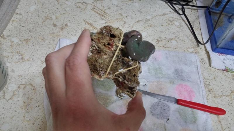 αυτό τώρα με λαστιχάκι το πιάνεις, απαλά όμως ίσα να το κρατάει επάνω στον βράχο , αν το σφίξεις πολύ θα το κόψει , ας ακουμπάει και το καπέλο επάνω στον βράχο δεν πειράζει . Αν θρέψει θα κάνει καπελο και από την άλλη πλευρά . καλύτερα να το βάλλεις σε καθαρό κομμάτι βράχου να μην έχει υπολοίματα λιωμένου κοραλλιού και να κόψεις και να πετάξεις από το κοράλλι την λιωμένη άκρη με ένα κοφτερό μαχαιράκι η νυστέρι να το ντιπάρεις να το ξεπλύνεις και μετά κόλλημα σε σημείο με λίγη κυκλοφορία