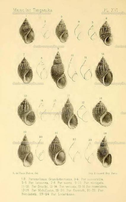 (τα οποία με την ευκαιρία να σημειώσω εδώ ότι παρόλο που τα άδεια κελύφη τους αποτελούν την κατοικία πολλών ειδών κοχυλόψαρων, ψάρια που ζουν σε σχετικά μικρό βάθος, αυτά ζουν σε βάθος 50 μέτρων και δεν ανεβαίνουν πιο ψηλά. Ο Pierre Brichard παρατήρησε ότι μεταφέρονται στα ρηχά από συνοδόντηδες που τα έχουν για τροφή.) υπάρχουν και πολλά άλλα όμορφα αλλά άγνωστα είδη στους ενυδρειόφιλους. Μερικά απ' αυτά : Paramelania damoni ![]() Martelia tanganyicensis ![]() Paramelania iridescens Tiphobia horei |