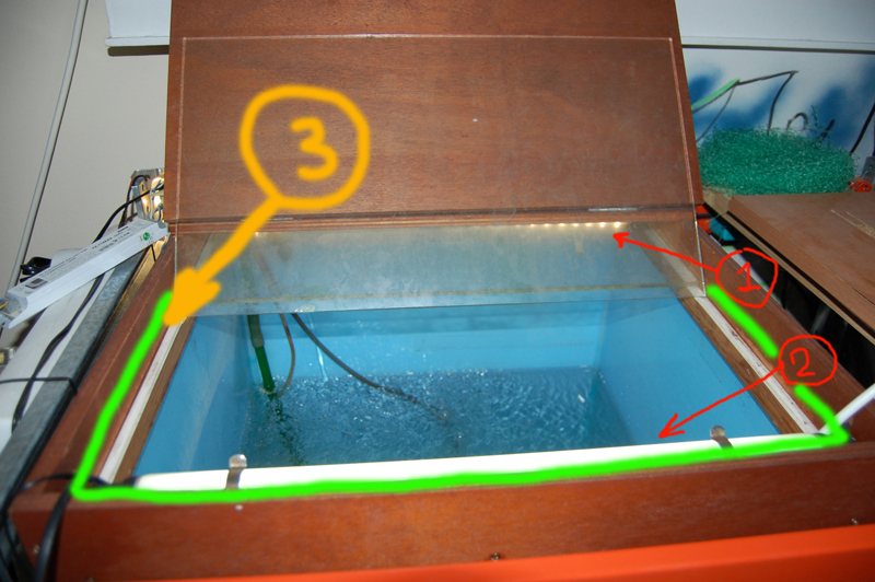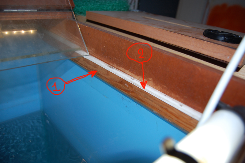 4. Εσωτερικά υπάρχει "ξυλαράκι" (1) για να πατάει στο τζάμι του ενυδρείου... και πάνω σε αυτό έχω βάλει πλαστικό υλικό (2)για να ΜΗΝ "τρέχουν" οι υδρατμοί και σχετική στεγανότητα.