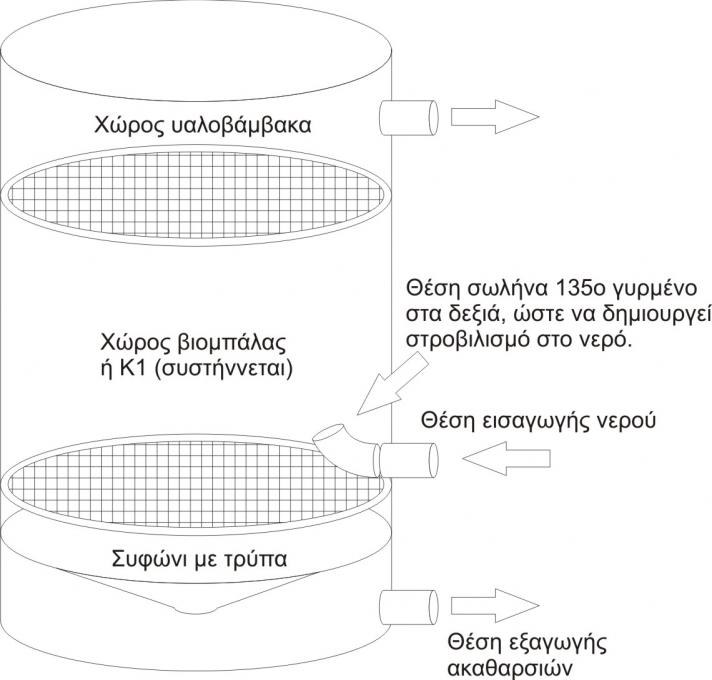 Βασικά (προσωπική εκτίμηση) θα πρέπει να το ελευθερώσεις καταρχάς από τα πολυποίκιλα υλικά που του έχεις σχεδιάσει. Αυτό είναι το πρώτο και το σημαντικότερο. Οι βιομπάλες που θα χρησιμοποιήσεις καλό να είναι το 80%-90% της βιολογίας σου. Τα σφουγγάρια, απλά θα δυσχεραίνουν το έργο του φίλτρου. Ο υαλοβάμβακας μπορεί να δουλέψει καλά στο μηχανικό κομμάτι του φίλτρου σε τέτοια φίλτρα. Αν κατασκεύαζα αυτό το πράγμα, θα αντλούσα νερό από την κάτω θέση του φίλτρου και θα έκανα εξαγωγή από την πάνω θέση του σχεδίου σου. Η μοναδική διαφορά θα ήταν ότι το σημείο της άντλησης θα το έκανα λιγάκι πιο ψηλά από το δικό σου σημείο, χρησιμοποιώντας σωλήνα γωνιά 135ο ώστε να δημιουργήσεις εσσωτερικά περιστροφικη κίνηση του νερού, πιο κάτω, δημιουργείς εσσωτερικά ένα ανάποδο κώνο με τρύπα στo πιο χαμηλό του σημείο, ώστε να κατακάθονται εκεί οι ακαθαρσίες. Είναι δεδομένο ότι πρέπει να χρησιμοποιήσεις πλαστική σχάρα για να μην μπαίνει το βιολογικό σου υλικό στο χώρο των ακαθαρσιών. Στον χώρο αυτό, δημιουργείς ακόμα μια τρύπα όπου θα καθαρίζει αυτόματα το σύστημα σου. Στο άνω σημείο του φίλτρου, μπορείς να τοποθετήσεις ακόμα μια σχάρα και από πάνω του αν θέλεις υαλοβάμβακα. Μπορείς εύκολα αυτό να το κάνεις και ανοικτού τύπου. Είναι δύσκολο να στο εξηγήσω έτσι... θα σου κάνω ένα σχεδιάγραμμα! Γιατί όμως να το κάνεις πιεστικο? Τί θα κερδίσεις περισσότερο?