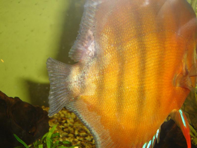 Έχω ένα ενυδρείο 200 λίτρων (εδώ και 6 μήνες) με εσωτερικό βιολογικό φίλτρο, φυτεμένο με λίγα φυτά (προς το παρόν) με 4 δίσκους και 8 ροδόστομα. Πριν 3 εβδομάδες ο μεγαλύτερος δίσκος παρουσίασε ένα εξάνθημα στο άνω και κάτω πτερύγιο και στην ουρά, το οποίο εξελίχθηκε και κατέστρεψε μέρος των πτερυγίων (επισυνάπτω φωτογραφίες). Σε κατάστημα μου είπαν ότι είναι Ick και μου έδωσαν δύο φάρμακα (Contra Ick της Tetra & Myxazin της waterlife), που έβαλα σύμφωνα με τις οδηγίες. Αρχικά υπήρξε επιδείνωση (για 2-3 ημέρες), στη συνέχεια όμως βελτιώθηκε μέχρι θεραπείας.10 ημέρες μετά και αφού είχαν αρχίσει να αναπλάθονται τα πτερύγιά του, επανεμφανίστηκε στο άνω πτερύγιο. Αυτή τη φορά έβαλα αμέσως myxazin και bacterlife (της waterlife) αφού αντικατέστησα το 25% του νερού και η αθένεια δεν προχώρησε. Επίσης πρόσθεσα αλάτι.