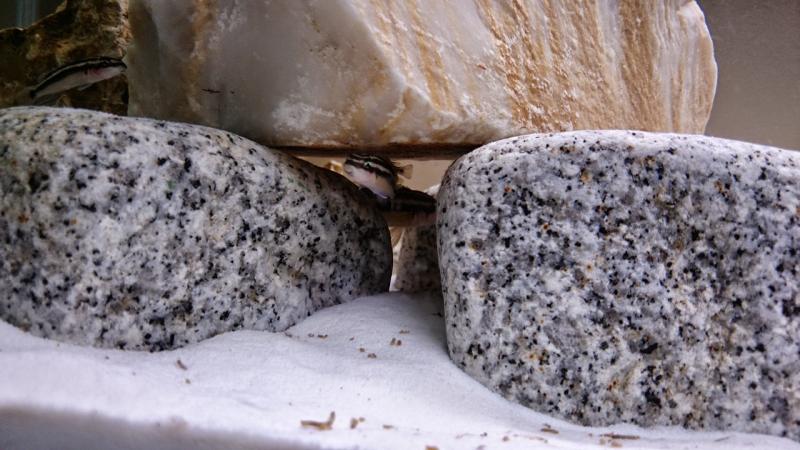 θα πρότεινα μια ομάδα από ένα είδος κοχυλόψαρα (πχ Neolamprologus similis, N.multies) και ένα ζευγάρι/χαρέμι μικρόσωμα πετρόψαρα Julidochromis (πχ transcriptus,ornatus). |
