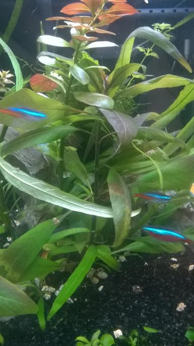 Έχουμε λοιπόν και λέμε: Διαστάσεις: 80 Μ, 40 Π, 35 Υ Όγκος: 90 Λίτρα ωφέλιμο περίπου Κατηγορία: Κοινωνικό φυτεμένο Φυτά: Vallisneria Gigantea, Java fern, java moss και άλλα τα ονόματα των οποίων δεν τα θυμάμαι (όλα από τον φίλο Μισιρλή). Ψάρια / ¶λλα είδη: 15 tetra neon, 5 καρδιναλιους, 1 sae, 8 red shrimps, 2 japonica amano , Golden Apple Snails, Bladder Snails, 5 zebra snails και προσωρινά 1 πλεκο. Διακοσμητικά υλικά: χαλίκι, ξύλα, πέτρες κ.λ.π. Φόντο: Μαύρο Φωτισμός: 98 watt (2 sylvania grolux 18w t8, 2 ψυχρού φωτός t8 18w, και 2 t5 θερμού φωτός 13w) Διάρκεια φωτισμού: 10 Ωρες (12:00-22:00) Φιλτράρισμα: εξωτερικό φίλτρο με 4 λίτρα ελαφρόπετρα (1000lt/h) και ένα εσωτερικό με 1 λίτρο ελαφρόπετρα (880Lt/h). Θερμοστάτης: 100W Λίπανση: Λιπάσματα από το φίλο Μισιρλή (ιχνοστοιχεία - κάλιο) Παροχή CO2: Μπουκάλα CO2 2 λίτρων με ηλεκτροβάνα |
