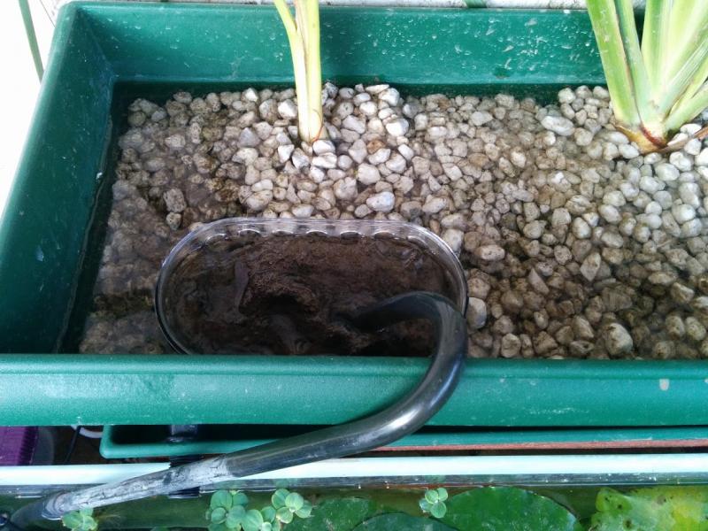Εδώ όπως ήταν στα τέλη Οκτωβρίου Στην είσοδο μπήκε καλαθάκι με ενυδρειακό βαμβάκι Στις επιστροφές μπήκαν ρακόρ και κομμάτια σωλήνα γιατί έκανε πολύ θόρυβο το νερό που έπεφτε από ψηλά. Έβαλα και ένα κομμάτι σίτα πλαστική για να προσατεύονται από τυχόν φύλλα και άλλα σκουπίδια που θα μπορούσαν να τις φράξουν. Έτσι είναι σήμερα (η ποντεδέρια έχασε τα φύλλα τελείως αλλά νομίζω θα ξαναπετάξει την άνοιξη). |