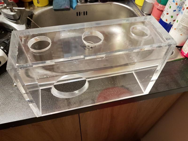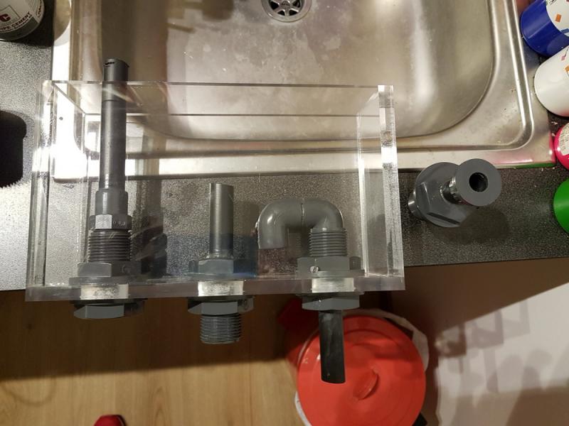καθώς στήνω εκ νέου το ενυδρείο ένα από τα βασικά προβλήματα που είχα να λύσω είναι πώς θα κάνω αθόρυβη υπερχείλιση. Το ενυδρείο Jewel 400 έιχε μία τρύπα Φ60 μόνο και προφανώς δεν ήθελα να ανοίξω νέα. Δοκίμασα με ένα σωλήνα με διάφορες γωνίες Δοκίμασα με εξαγωγή κατευθείαν σε λάστιχο Δοκίμασα με διακλάδωση αμέσως μετά το τζάμι ώστε να είναι η μία εξαγωγή γεμάτη και η άλλη απλά συμπληρωματική. Δυστυχώς λόγο της μεγάλης διαμέτρου οτι κι αν έκανα (με την λογική οτι για λόγους ασφάλειας δεν ήθελα να το φράξω και αν κολλήσει κάτι στην βάνα να πλημμυρήσω) είχε πολύ θόρυβο. Ψάχνοντας για τρόπο να την κάνω αθόρυβη είδα την Eshopps Eclipse η οποία είχε αρνητικό (εκτός του κόστους) οτι στο σημέιο που ήταν η τρύπα του ενυδρείου δεν είχα χώρο για την τοποθέτηση. Πήρα την ιδέα όμως και σκέφτηκα να φτιάξω εγώ μία που θα λειτουργεί με τον ίδιο τρόπο! Παραγγελία Plexiglass πάχους 1cm λοιπον στις διαστάσεις που ήθελα (κόστισε 25¤) και την συνέχεια μπορείτε να την δείτε στις φωτογραφίες που ακολουθούν. Προσοχή στις εσωτερικές διαστάσεις γιατί ήμουν τυχερός και με διάφορες πατέντες ξεπέρασα το ότι δεν είχα υπολογίσει σωστά το μέγεθος από τους σωλήνες) Πλέον το νερο κατεβαίνει απο ένα σωλήνα Φ20 ελάχιστο απο τον δεύτερο και υπάρχει και τρίτος σαν εφεδρικός. Αντλία επιστροφής είναι μία Jebao DCT 6000 και λειτουργεί στο 90% Πιστεύω οτι είναι μια καλή λύση για όσους αντιμετωπίζουν παρόμοιο πρόβλημα. Σχόλια παρατηρήσεις ευπρόσδεκτα... |