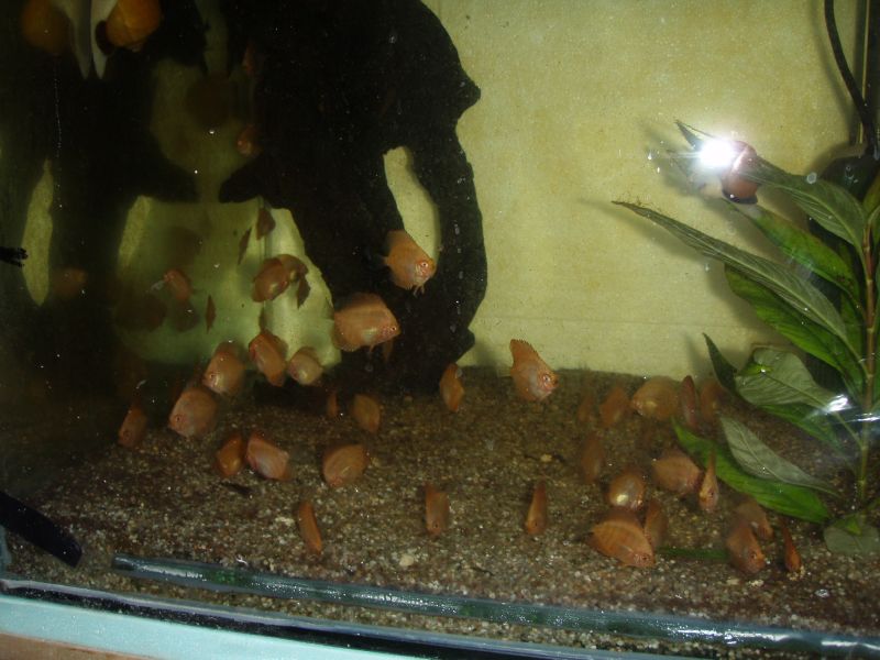 Σας παραθέτω νέες φωτογραφίες από τα μικρά, καμιά 25αριά, (free swimming 24-08-07) που έχουν παραμείνει σε ενυδρείο 50*50*50. Η ανάπτυξή τους πιστεύω ότι είναι καλύτερη από αυτή των άλλων μικρών από την ίδια γέννα που έχουν ήδη μεταφερθεί σε άλλα ενυδρεία. Πιθανόν λόγω της συνεχούς αλλαγής νερού, που έχω αναφέρει παλαιότερα.