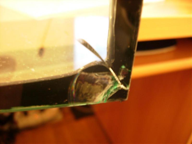 τι σας λεει αυτο το ραγισματακι?αποσο βλεπω λογικα θα ειναι στεγανο εκει στη γωνια που εχει παθει τη μεγαλυτερη ζημιουλα εχει πολυ σιλικονη απο μεσα και η ρογμη δεν ειναι κατι διαμπερες αλλα φοβαμαι μην κανει κρακ αμα το γεμισω δεν το χω γεμισει ακομα ειναι ενα 50λιτρο με κυρτο τζαμι μπροστα και 4χιλ τζαμι
