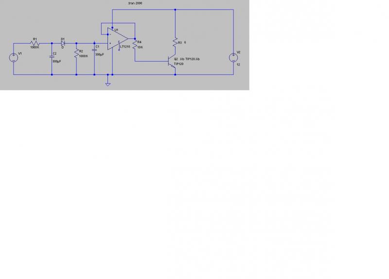Λοιπόν, μελετησα λίγο παραπάνω την "απλή" περίπτωση. Έβαλα ένα darlington, το tip120 το οποίο λογικά θα είναι "άνετο". Αντί να τροφοδοτώ το τρανζίστορ κατευθείαν από τον πυκνωτή και να μειώνεται η ένταση πολύ γρήγορα, έβαλα ένα buffer με op-amp, το οποίο φαίνεται να δουλεύει πολύ καλύτερα στο spice.