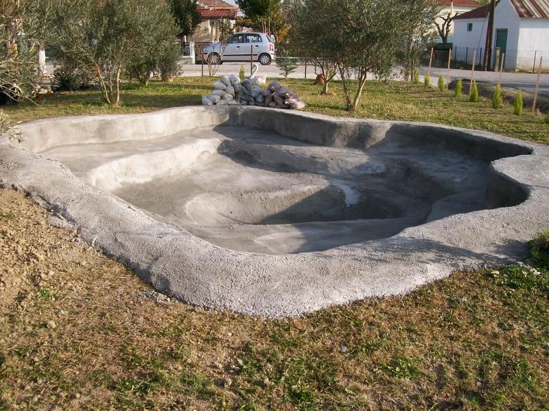 σκαπτικο μου ανοιχε την λιμνη. μετα εγω και ο πατερας μου πηραμε τα χωματα και την καναμε ποιο ομαλη. διαστασεις εχει 8 x 8 περιπου. βαθος 1.60 . χωρητικοτητα 20000 ισως και παραπανο! 8 κυβικα τσιμεντο συν αλλα 2 κυβικα για τσιμεντοκονιαμα. ρητινη εβαζα σε καθε χαρμανιερα. εβαλα πολυ καλο χαλικι ρητινη επισης αυτες που βαζουν και στα υδραγογια. η τσιμεντοκονια την βαλαμε με σπατουλα και μαλα. καναμε ενα πηχτο χαρμανι σαν χυλος ωστε να πεσει μπολικο πραμα και να κλεισουν οι ποροι καλυτερα. τα πετα τα βαλα εγω με τον πατερα μου τον ξαδερφο μου και τον θειο μου που χερει απο τσιμεντα αλλα δεν κανει πλεον αυτη την δουλεια λογο συνταξεις. πολυ κουραση αλλα και ανχος! επσαχνα liner αλλα τιποτα! σημερα αρχισα να την διακοσμω και αυριο σιγα σιγα γεμιζει! θα ανεβασω και αλλες φωτο αυριο!