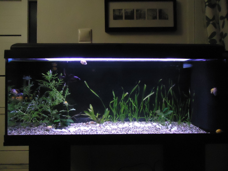 Κάπου στο γενάρη, όταν άρχισα κι εγώ να ασχολούμαι με τα ενυδρεία μετά από δικό της δώρο διαπιστώνουμε ότι ο Τάσος κι ο Σώτος ασφυκτιούν μέσα στο 25λιτρο λαμπατέρ οπότε αποφασίζουμε με την πρώτη -οικονομική- ευκαιρία να πάρουμε μεγαλύτερο. Ταυτόχρονα προκύπτει από δώρο γεννεθλίων και ένα πανέμορφο Black Moore οπότε η ανάγκη γίνεται επιτακτική!