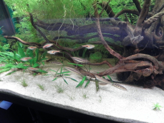 Διαστάσεις:78*31.5*35 Όγκος:70λτ Κατηγορία:βιοτοπικο; Φυτά:limnophila sessiflora,rotala rotundipholia,cryptocoryne crispatula var balansae-parva-wendtii green-willisii, vallisneria sp.,eleocharis parvula,pogostemon helferi Ψάρια / ¶λλα είδη:4 female bettas,1 male betta,7 rasbora hengeli,7 botia sidthimunki,red cherry shrims Διακοσμητικά υλικά: (χαλίκι, ξύλα κ.λ.π.) αμμος, ξυλο Φόντο: Φωτισμός:2*24 τ5 Διάρκεια φωτισμού:8 ωρες Φιλτράρισμα:enheim 2211 Θερμοστάτης:100w Λίπανση: Παροχή CO2: Παράμετροι: pH:7 Γενική σκληρότητα (GH):8 Ανθρακική σκληρότητα (ΚΗ):6 Αμμωνία (ΝΗ3): Νιτρώδη (ΝΟ2):0 Νιτρικά (ΝΟ3):15 Αλλαγές νερού:καθε εβδομαδα 15λτ Θερμοκρασία:25 ¶λλες πληροφορίες: Φωτογραφία: |