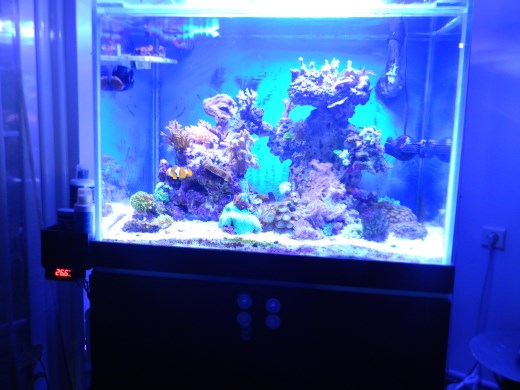 Διαστάσεις display (MxΠxΥ) : 80 x 60 x 65 Όγκος display (l) : 280 Διαστάσεις sump : 50 x 35 x 45 Όγκος sump (l) : 75 Φωτισμός : Pacific Sun Black Python 120w, DIY 36W Led Skimmer : Aqua Medic Turboflotor Blue 1000 (2000lt pump) Κυκλοφορία : Tunze 6025, Vortech MP10w es, EHEIM Compact 3000 (επιστροφη) Φίλτρανση : Refugium, DSB Διατήρηση παραμέτρων : Balling method Ζωντανα: 2 x occelaris clownfish, 1 x salarias, 1 x bicolor dottyback 1 x Pepermint shrimp, 1 x boxer shrimp 2 x Turbosnail, 10 x ερημιτες Υλικά : Χημικα Θερμοκρασία : 26,5 Αλατότητα : 1026 Νo3 : 0 Po4 : 0 Ca : 400 Alk : 8 Mg : 1350 Αλάτι : Korallen Zucht Αλλαγές νερού : 25λτ καθε εβδομαδα Λοιπός εξοπλισμός : A/O.Ro-Di 6 σταδιων 2πλη μεμβρανη με TDS meter Water waves Αναπληρωση: Tunze water level controller 5017 Ελεγχος θερμοκρασιας.Εliwell IC902. αντίστασηTetratec 300w, chiller Teco TR 10 PH monitor: Milwaukee SMS 122 Dosing pump Marine color MCD-3-M Refractometer: Sybon ORP meter: HM Digital |