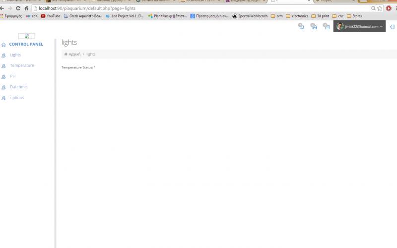 Οπως φαινεται απο το διαγραμα οι λειτουργιες που κρατησα ειναι : - Ελεγχος φωτισμου σε τρια ανεξαρτητα καναλια, με ανατολη/δυση,ωρες μεγιστου φωτισμου, κυκλο σεληνης κλπ - Ελεγχος pH με θερμοκρασιακη αντισταθμιση. - Ελεγχος θερμοκρασιας με αισθητηρα RTD (pt1000). - Εξοδος για ελεγχο θερμαντικου & Fan με ξεχωριστες ρυθμισεις. - 2 καναλια ελεγχου θερμοκρασιας / υγρασιας χωρου με εξωτερικους αισθητηρες - Διαυλος επεκτασης για περισσοτερα στο μελλον - Ελεγχος μεσω web/internet - Υποστηριξη WEB camera - Ειδοποιησεις με email Δυστυχως ειδικες λειτουργιες θαλασσινου δεν εχω γιατι απο θαλασσα ειμαι ασχετος. Περιμενω και καμμια ιδεα φυσικα .... |