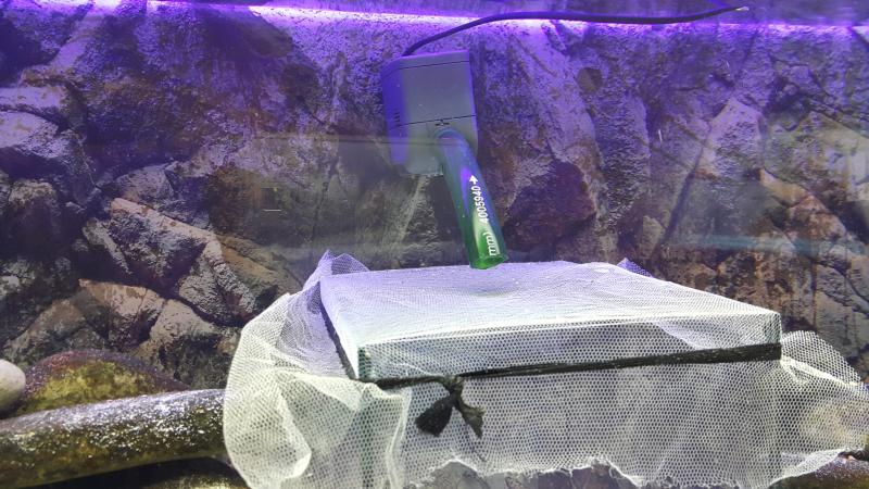 Βάλε μέσα την έξοδο μιας αεραντλίας για να γίνεται κυκλοφορία του νερού. |