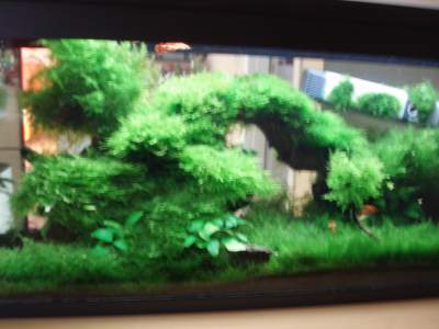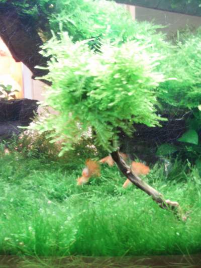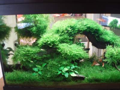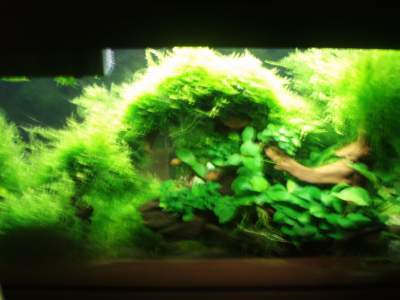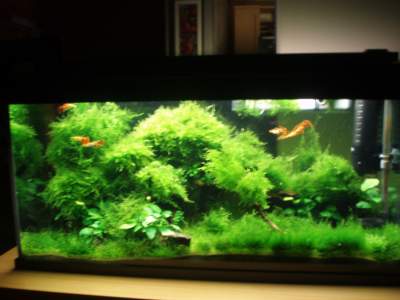 Καλησπερα σε ολους μετα απο πολυ καιρο , αφησα το ενυδρειο λιγο στην τυχη του με την εννοια οτι δεν επενεβησα και πολυ , με λιγα λογια οι μοσ κυριαρχησαν σε ολο το ενυδρειο και εκαναν ουσιαστικα αυτες carpet και επνιξαν και τις ανουμπιες αλλα το αποτελεσμα ειναι πολυ φυσικο και πανεμορφο το Co2 σταθερα σε 40mg/L και το ph στο 7,0 , Kh = 8 , gh = 9 , η θερμοκρασια στους 24.5-25.5 C . Τα ψαρακια που εχω ειναι guppy δικής μου επιλεκτικης αναπαραγωγης 3,5 μηνων αρσενικα 8 συνολικα στον αριθμο . Γενικα ολα κυλανε πολυ καλα και τα ψαρακια τα πανε περιφιμα ! Μερικες φωτο ενδεικτικα που εβγαλα οι εξης :