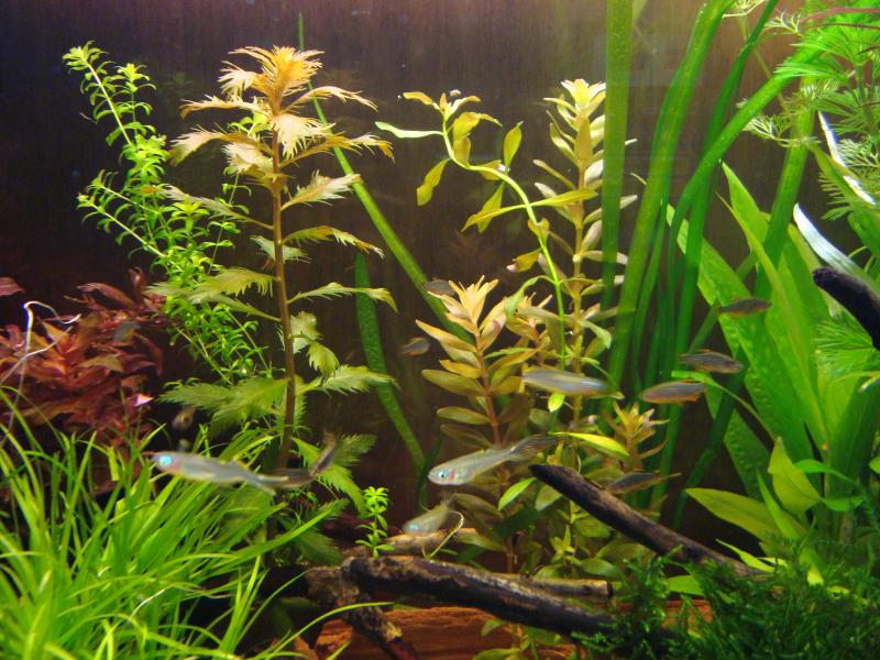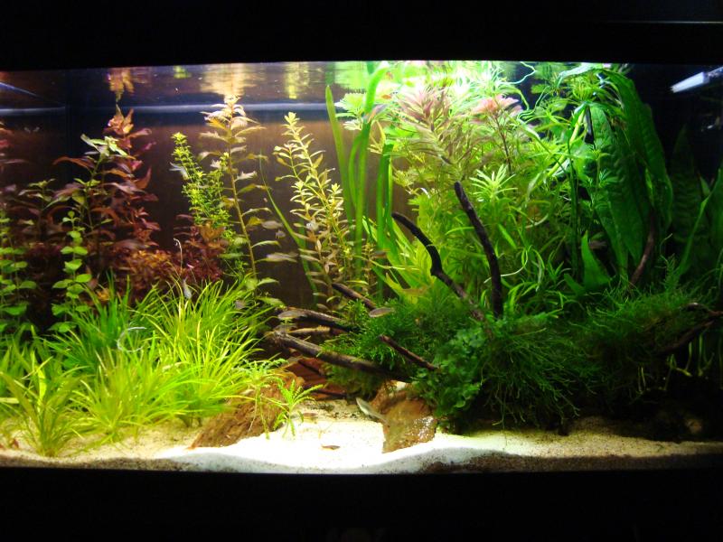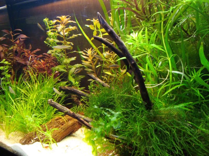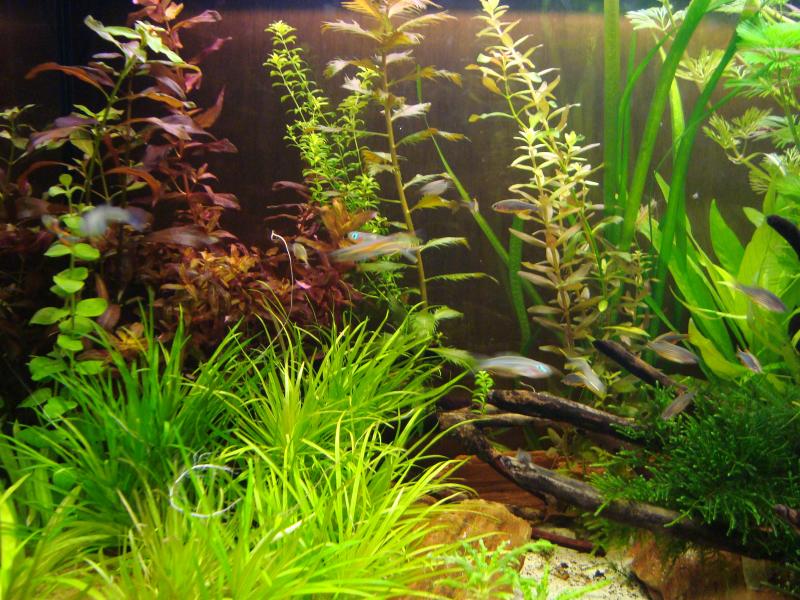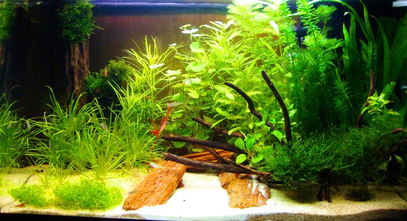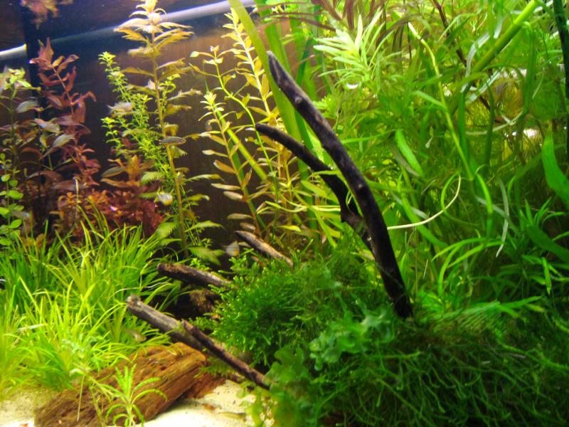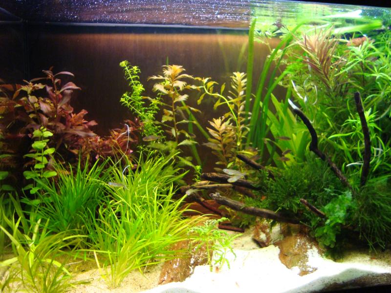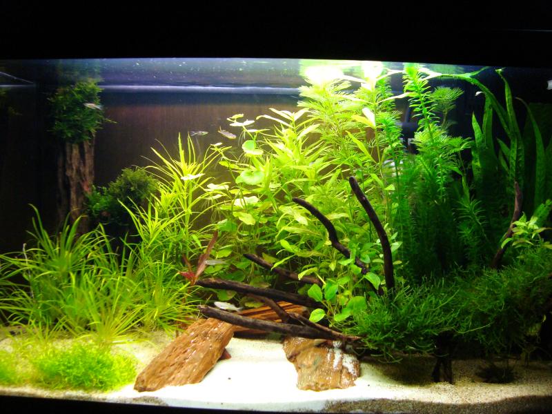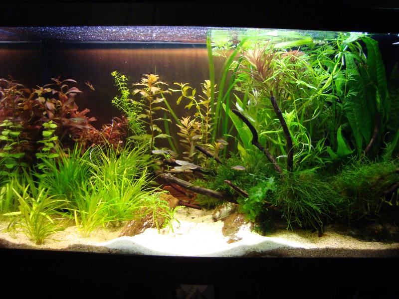 Εγώ θα έλεγα καθόλου φυτά και γαρίδες μόνο ξύλα, ξερά φύλλα στον πάτο blackwater και ένα ζευγάρι ramirezi... Έχω την εντύπωση ότι τα λίτρα φτάνουν... ή κάνω λάθος?