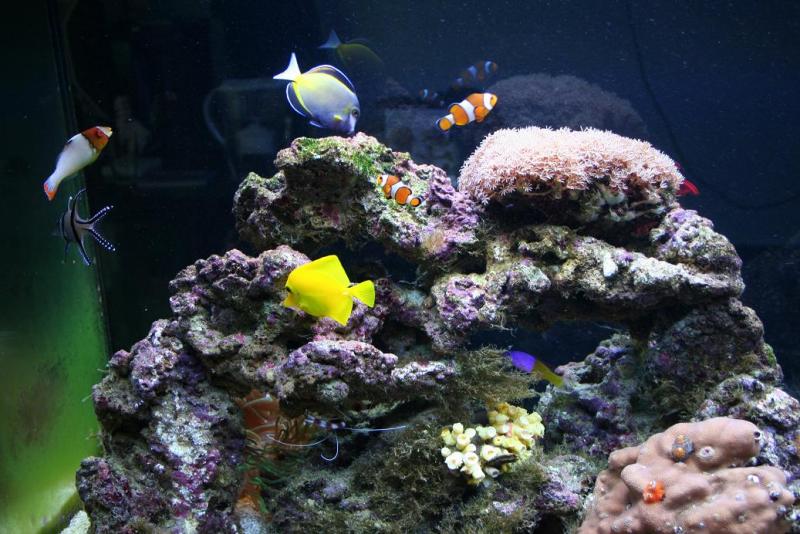 Στην τρίτη συνημμένη φωτό η εν λόγω πρασινάδα έχει φυτρώσει πάνω σε ενα τουρμπο σαλιγκάρι, εχω δύο απο δάυτα, τα εχω ονομάσει Ράμπο Ι και Ράμπο ΙΙ λόγω της ''παραλλαγής''. Να τονίσω το γεγονός οτι εχω σύνολο 354Watts Τ5 σε 400λ. ενυδρέιο Ευχαριστώ εκ των πρωτέρων AquaTech 400λ. (100 gallon), 140Χ40Χ72 100λ. (25 gallon) sump, 5 διαμερισμάτων. Sump -Κυκλοφορητής επιστροφής: Tunze Master 1073.03 στα 3000 λ.α.ω. -Διάφορες κεραμικές και πλαστικές βιόσφαιρες, noodles κτλ. -V2 protein skimmer με bubble stop – αντλία Rio 2100 -Λάμπες UV: 9W Aqua Medic Helix Max + 11W De Barry AN-11E (σε σειρά) – αντλία Eheim 300 -Ψύκτρα ClimaPro 750 – αντλία Eheim 1000 Κυρίως Ενυδρείο -40 κιλά (90 lbs.) υπόστρωμα αραγωνίτη -55 κιλά (120 lbs.) ζωντανός βράχος απο Ινδονησία -Ψηφιακό Θερμόμετρο -Blowers: Hydor Koralia 4 (11W, 4600 λ.α.ω.) 12ωρη λειτουργία + Hydor Koralia 2 (4.5W, 2300 λ.α.ω.) αδιάκοπη λειτουργία. -Φωτισμός: 2Χ 54W T5 46” HO Arcadia Marine White 14,000Κ 54W 46” T5 HO Life-Glo 6700K 54W 46” T5 HO Power-Glo 18000K 54W 46” T5 HO Marine-Glo Actinic 54W 46” T5 HO Arcadia Marine Blue 420 Actinic 3 Glo ballasts (2x54W έκαστο). Σύνολο 324 Watt Οργανισμοί -2 Clowns - Amphiprion ocellaris -1 Blue Tang (Pacific Blue Tang, Palette Surgeonfish) - Paracanthurus hepatus -1 Yellow Tang - Zebrasoma flavescens -1 Green Mandarinfish (Striped Mandarinfish) - Synchiropus Splendidus -1 Banggai Cardinal Fish - Pterapogon kauderni -1 Bicolor Parrotfish - Cetoscarus bicolor -1 Longfinned Sleeper Goby - Valenclennae Longipinnis -1 Yellow Shrimp Goby (Yellow Watchman Goby) - Cryptocentrus Cinctus -1 Orange Lined Sleeper Goby - Valenciennea decussatus -1 Bicolor (Royal) Dottyback - Pseudochromis paccagnellae -2 Humbug Dascyllus (Striped Damselfish) - Dascyllus Aruanus -2 Yellowtail Blue Damselfish (Yellowtail Demoiselle) - Chrysiptera Parasema -1 Coral Beauty Angelfish - Centropyge bispinosus -1 Boxer Shrimp - Stenopus hispidus -2 Turbo Snails - Turbo fluctuosa -2 Brittle Stars - Ophiocoma erinaceus and Ophiocoma riisei (Κοράλλια) -1 Bright Green branching Alveopora -1 Devil's Hand Leather Coral - Lobophytum pauciflorum -1 Elegance Coral -1 Fox Coral - Multicolor Christmas Tree Worms σε Spirobranchus porites -1 κλαδί με Pink Button Polyps -1 Ανεμώνη αγνώστων λοιπών στοιχείων Διάφορα Αλάτι: Dupla Marin Premium salt H2O Conditioner: JBL Biotopol Βακτήρια: Διάφορες μάρκες, κυρίως Tetra Marine Safestart Τροφή: Dr.Bassleerʼs Biofish food pellets, γαρίδες Artemia, γαρίδες Krill, Dupla Marin Reef Power Supplements: Dupla Marin Spurenelementemix, Seachem Reef Complete Test kit: Tropic Marin Αλλαγές νερού: Μέχρι τώρα καμία. Αγορά ντεπόζιτου 150λ. Για αλλαγές 20% ανα διμηνία Παράμετροι νερού: Ammonium 0.1, Nitrite 0, Nitrate 0, pH 8.2, Alkalinity 6, Temperature 27.2 – 27.8C, Πυκνότητα 1.025, Ασβέστιο 400 mg/L |
