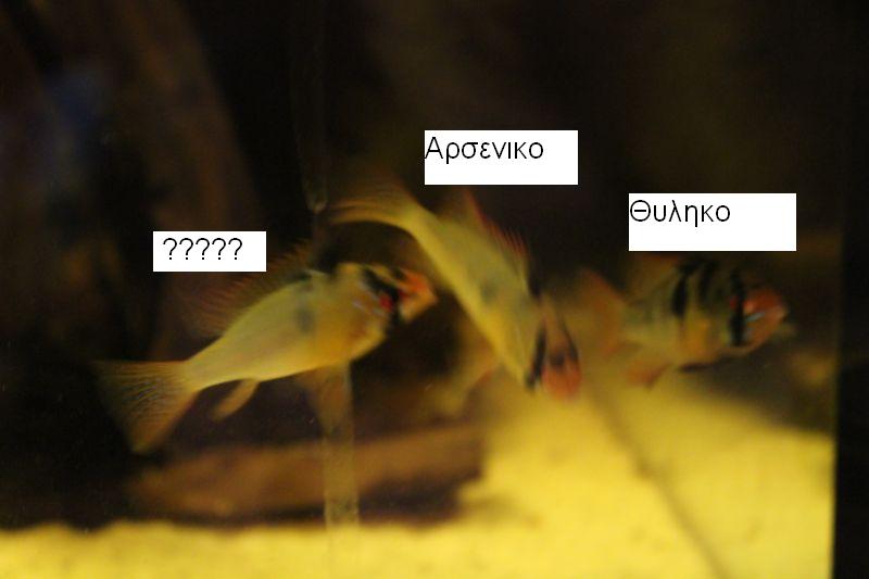 Θα ηθελα να δω 1-2 ακομη καθαρες πλευρικες φωτογραφιες των ψαριων τωρα που θα εχουν ηρεμησει και θα δειχνουν τα χρωματα τους για να γινει 100% διαχωρισμος του φυλου τους (υπαρχει καποια περιπτωση να ειναι δυο θηλυκα -οπως σου ειχα πει και στα ΠΜ).