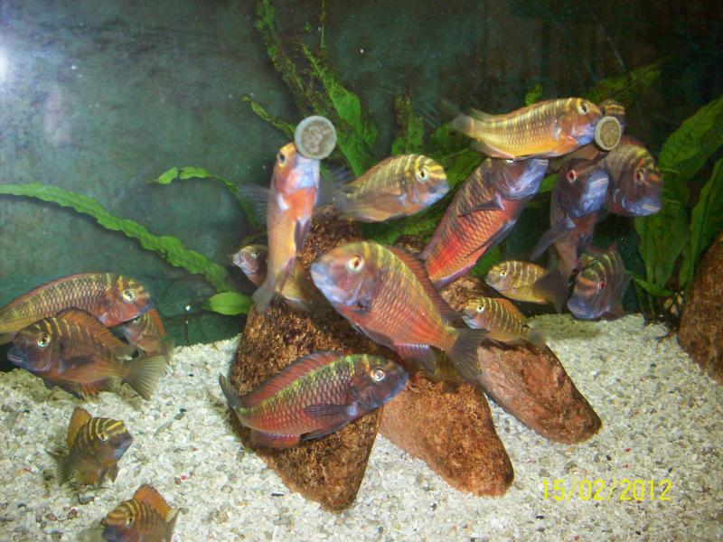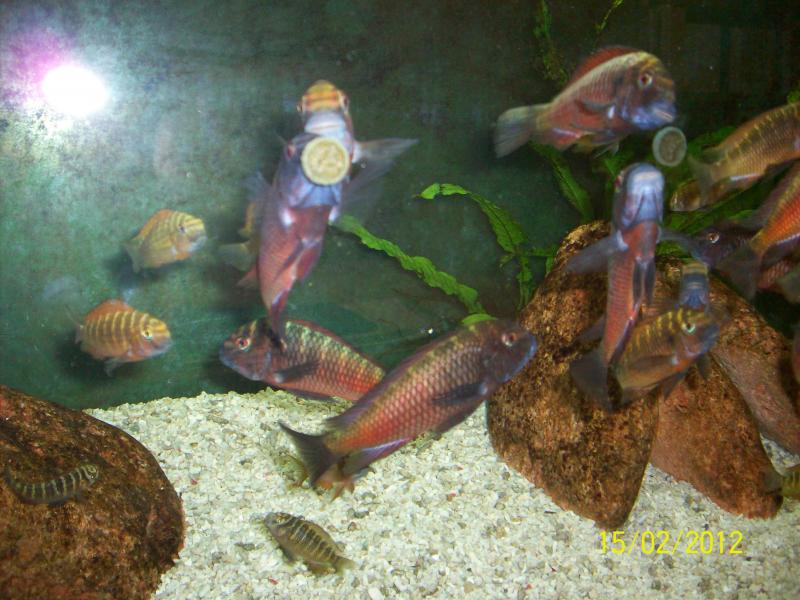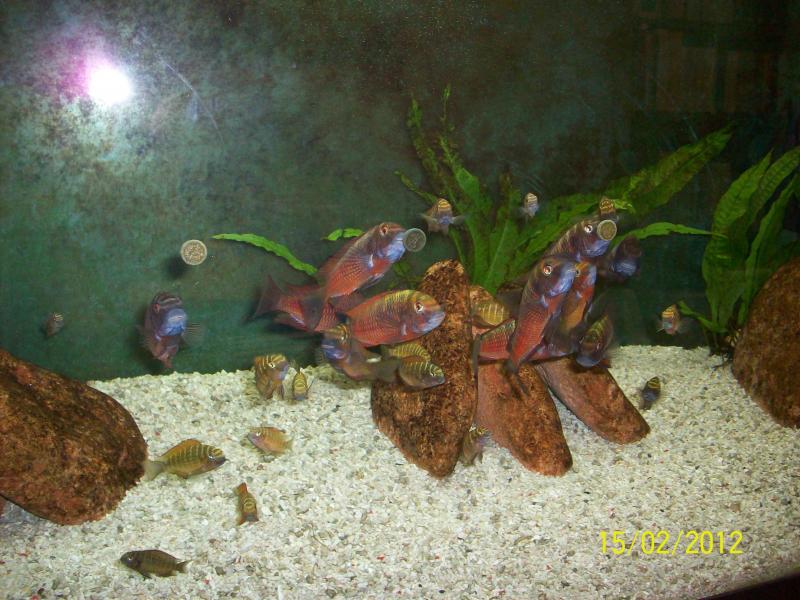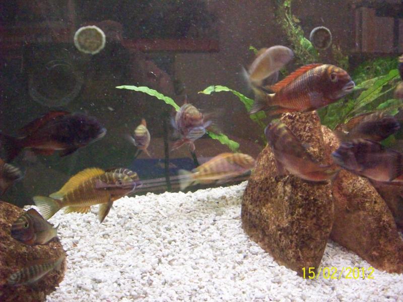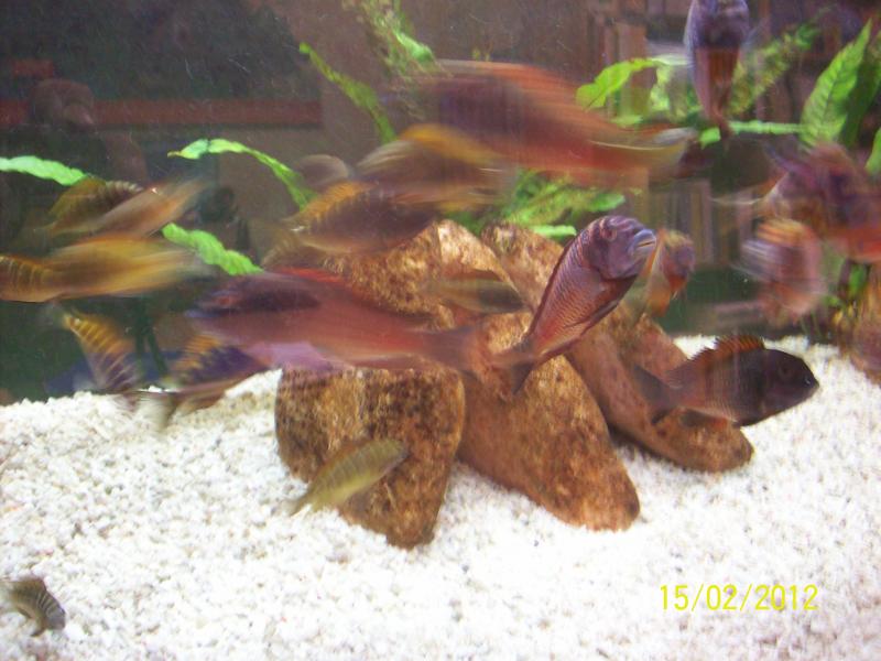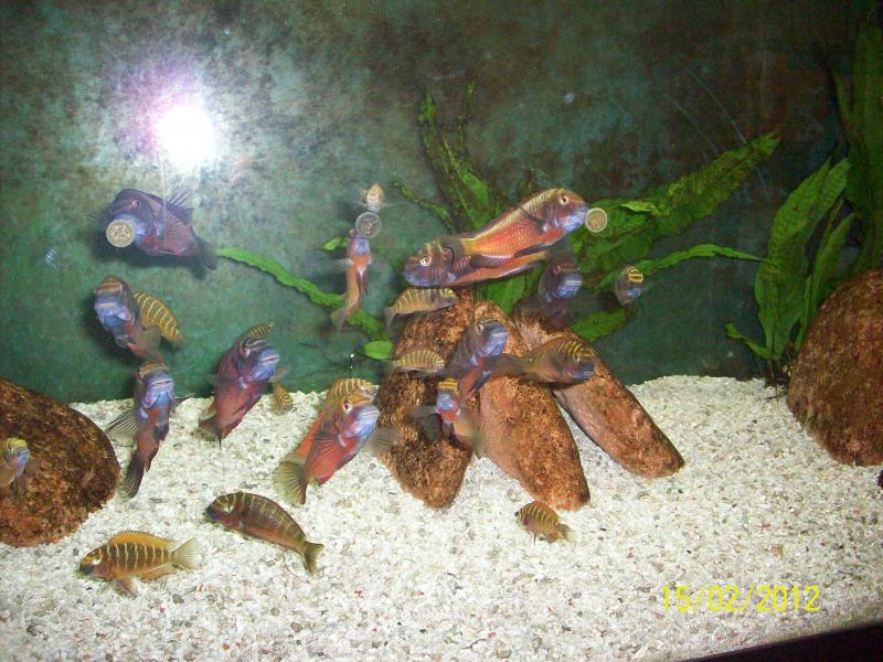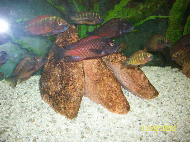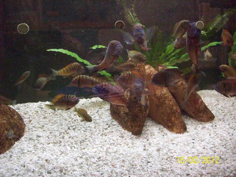Πληροφορίες Διαστάσεις:120,8 x 42,8 x 64,0 cm Όγκος: 330 λίτρα μικτά Φυτά: Microsorum pteropus (τα crinum που είχα βάλει στην αρχή χάλασαν Ψάρια: Tropheus sp. Red "Moliro" Διακοσμητικά υλικά: πέτρες, χαλαζιακή άμμος Hagen,Tropical marine sand, αραγωνίτης Nature's Ocean Φόντο: σκούρο πράσινο χαρτόπανο Φωτισμός: 3 λάμπες Τ8 χ 30W(2 daylight,1 Arcadia moonlight blue actinic) Διάρκεια φωτισμού: μόνο οι 2 daylight για 6 ώρες Φιλτράρισμα: Eheim 2080(1700 l/h) με enfi mech,substrat pro,σφουγγάρι. Fluval Fx5 (2300 l/h) με σφουγγάρια,substrat pro,siporax. Θερμοστάτης: Jagger 200W Λίπανση:- Παροχή CO2:- Παράμετροι Ph: 8-8.2 Gh: 15 Kh: 14 NH3/NH4: 0 NO2: 0 NO3: 5 Αλλαγές νερού: εβδομαδιαία 35-40% Θερμοκρασία: 24-25,5 C Τα ψάρια έχουν προσαρμοστεί εδώ και πολύ καιρό, 2 απο τα γεννητούρια μεγάλωσαν αρκετά, δεν υπάρχουν σκληρές κόντρες μεταξύ των αρσενικών και γενικά υπάρχει αρμονία στο κοπάδι. Το ενυδρείο είναι γεμάτο κίνηση, χρώμα και "άγρια" ομορφιά Μερικές (άθλιες και πάλι |