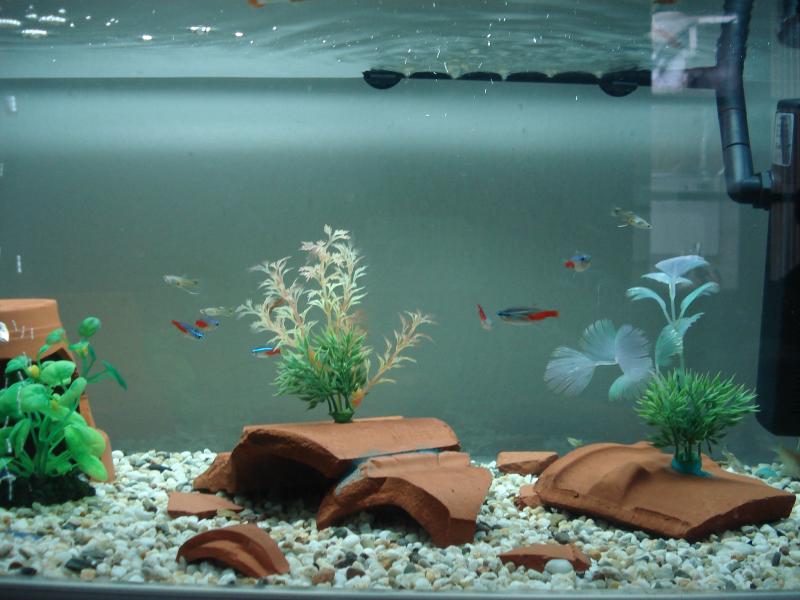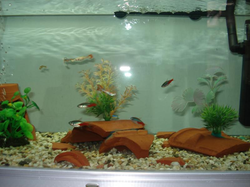 με ενα φιλτρο της sera εναν θερμοστατη της scuba και φως μια λαμπα φθοριου σαν αυτες που βαζουν στα ταβανια με λιγα guppy και λιγα tetra neon χωρις βιολογικο και πολυ αυτοσχεδιασμο οπως θα δειτε αλλα παρολα αυτα δεν ειχα πολλους θανατους...!!! |