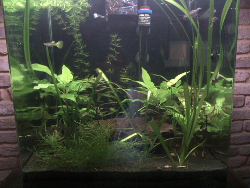 Διαστάσεις:38X38X43 Όγκος: 62 lt Κατηγορία:Κοινωνικό, φυτεμένο Φυτά:Ceratophyllum denersum, Hygrophylia spp, Taxiphyllum barbieri, Vallisneria austrelis, Ludwigia spp Ψάρια / ¶λλα είδη: 8 guppies male, 1 Zebra Nerite, αρκετοί "λαθρεπιβάτες" Διακοσμητικά υλικά: 1 ξύλο, χαλίκι Dennerle, Shrimp tubes Dennerle (χαλίκι, ξύλα κ.λ.π.) Φόντο: Μαύρο αυτοκόλλητο Φωτισμός: 2Χ 11 watt (νομίζω) Διάρκεια φωτισμού: 9 ώρες Φιλτράρισμα: Dennerle Corner Filter XL + Dennerle Filter Extension ( με Bio FilterGranulat) Θερμοστάτης: Eheim 75 watt Λίπανση: Sera κάθε 15 μέρες Παροχή CO2:- Παράμετροι: pH:7,5 (στικάκι) Γενική σκληρότητα (GH): 10 (στικάκι) Ανθρακική σκληρότητα (ΚΗ): 7 ( στικάκι) Αμμωνία (ΝΗ3): 0 (υγρό τεστ) Νιτρώδη (ΝΟ2): 0 (υγρό τεστ) Νιτρικά (ΝΟ3): 5 mg/l (υγρό τεστ) Αλλαγές νερού: 20 % κάθε 8-9 μέρες Θερμοκρασία: 25 ¶λλες πληροφορίες: Κάποια στιγμή θα μπούν Red Cherries Φωτογραφία: Τρέχει 3 μήνες περίπου, είχα κάποια προβλήματα με τους κατοίκους αλλα τώρα νομίζω είναι οκ. Ακούω παρατηρήσεις!! |