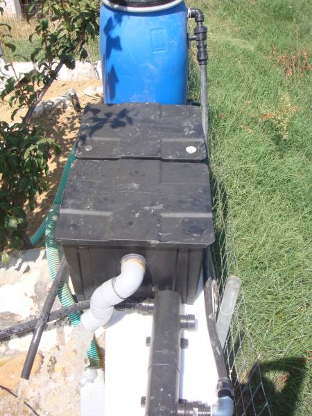το μπλε το βαρέλι είναι φίλτρο και αυτό με βιολογικά και σφουγγάρια και υαλοβάμβακα.