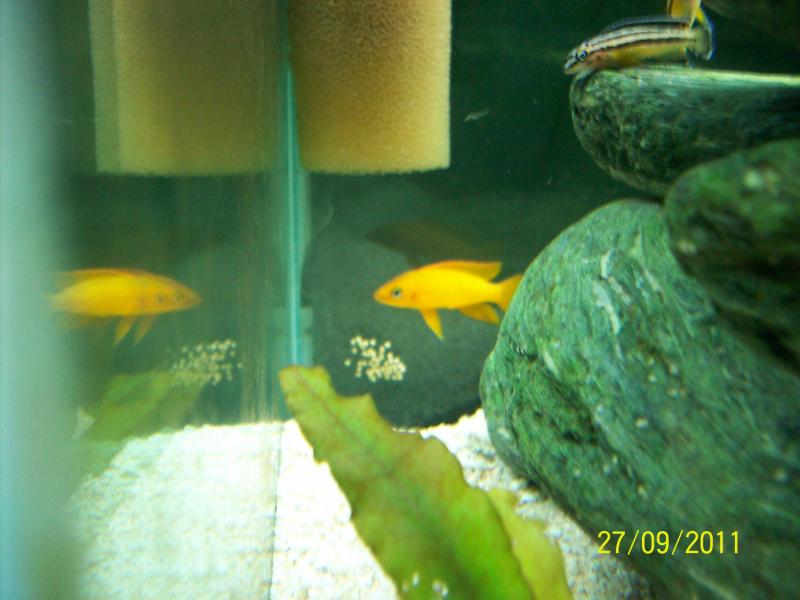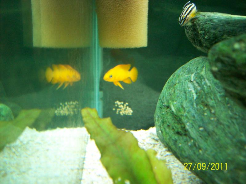 Στο ενυδρείο έχουν μείνει η αρχική τετράδα των N.leleupi (που έχουν πάρει αυτό το έντονο πορτοκαλί χρώμα λόγω της NLS), 1 ενήλικο J.regani "Kipili" (το άλλο ζευγάρι μετακόμισε σε άλλο ενυδρείο μόνο του, όπου γεννοβολάει διαρκώς) μαζί με μερικά μικρά και 4 A.calvus "Congo-black pearl" (http://www.aquatek.gr/vb/showthread.php?t=45439)που το μεγαλύτερο είναι 6+εκ. περίπου. Η συμβίωση είναι απροβλημάτιστη προς το παρόν. Τα leleupi είναι 2 ζευγάρια που έχουν γεννήσει (αλλά τα μωρά δεν υπάρχουν μετά από μερικές μέρες). Τα calvus είναι τα πιο φοβητσιάρικα,δεν έχουν διαμάχες μεταξύ τους, μεγαλώνουν πολύ αργά και ακόμη δεν έχω καταλάβει το φύλο τους (το ένα έχει μείνει αρκετά μικρότερο). Η φίλτρανση αυτή τη στιγμή γίνεται απο eheim 2073+2215. |