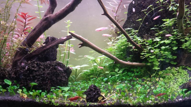 Δεν πηγαν τα πράγματα οπως τα ειχα υπολογισει,λογω των ψαριων αφαιρεθηκε μεγαλο μερος απο το χαρντσκεηπ(για να εχουν χωρο),και λογω red cherry εγινε χαμηλου φωτισμου χωρις co2 και λίπανση