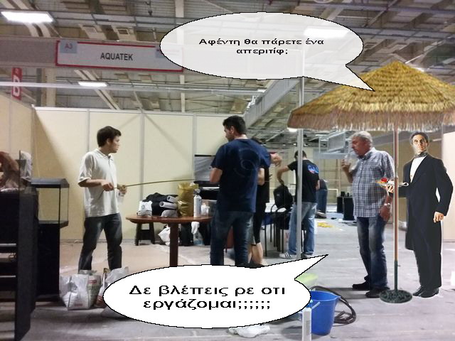 Σημερα οι δυο μοδ του θαλασσινού στο φόρουμ μας(kostas82 & sakis draminos) παρευρέθησαν στο περιπτερο μας και με ταχυδακτυλουργικές κινήσεις έστησαν το νάνο reef! Στην πρωτη φωτο ο Σάκης επι το έργον ![]()