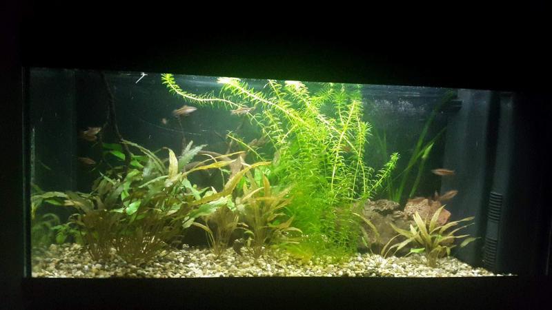 Διαστάσεις: 80μηκος 40 ύψος 30 πλατος Όγκος: γύρω στα 100 λιτρα Κατηγορία: Φυτά: java fern, cryptocorine wedtii tropica, egeria densa Ψάρια / ¶λλα είδη: cherry barb x18, zebra nerite x1 Διακοσμητικά υλικά: ξύλο driftwood, πέτρα λαβας, χαλίκι για βυθος (χαλίκι, ξύλα κ.λ.π.) Φόντο: μαύρο Φωτισμός: τ8 20 watt Διάρκεια φωτισμού: 8-10 ωρες Φιλτράρισμα: εσωτερικό φίλτρο με ροή 500 λίτρα την ώρα Θερμοστάτης: 100 w Λίπανση: flourish 2 φορές την βδομάδα το 1/3 της συνιστώμενης δοσης Παροχή CO2: όχι Παράμετροι: pH: 7,2 Γενική σκληρότητα (GH): δε γνωρίζω Ανθρακική σκληρότητα (ΚΗ): δε γνωρίζω Αμμωνία (ΝΗ3): 0 Νιτρώδη (ΝΟ2): 0 Νιτρικά (ΝΟ3): 10 - 20 Αλλαγές νερού: 40% την βδομασα Θερμοκρασία: 26 ¶λλες πληροφορίες: Φωτογραφία: ------------------------- Θα ανεβάσω κ άλλες φωτογραφίες από Δευτέρα ☺ Τελευταία επεξεργασία από το χρήστη Yiannis1 : 31-03-18 στις 02:05 Αιτία: Automerged Doublepost |