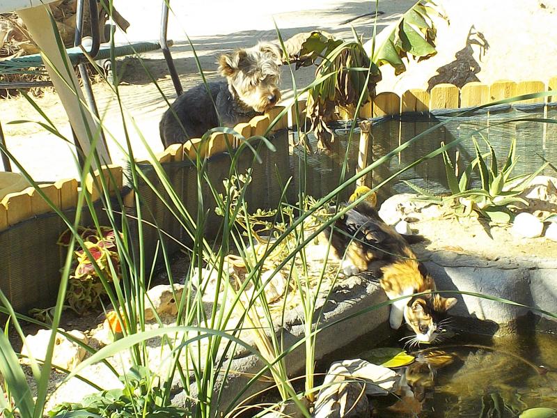 το γατουλι ειναι δικο μας και γυρωφερνει εκει με τον σκυλακο μαζι.. οπςσ παρατηρισες απο πισω .. λοιπον 2 φορες το γατουλι προσπαθησε να πιασει ψαρακι και ο σκυλακος τον εσπρωξε μεσα στην λυμνη