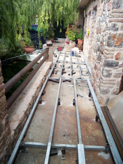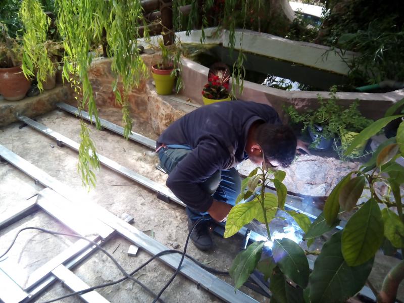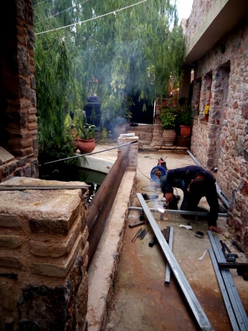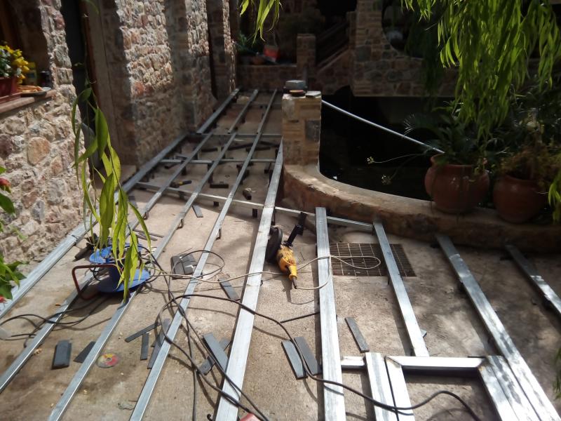 Οκ, πάμε πάλι. Εδώ το συνεργείο των σιδεράδων δηλαδή ο φίλος μου ο Λεό. Αμείφθηκε μόνο με μπύρες ο ακατάδεχτος, ούτε το ξακουστό ντολμαδάκι της μητέρας μου δεν ακούμπησε. Αλφαδιάζει το πάτωμα για το ντεκ στην αυλή.