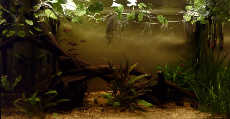 Εδω το ενυδρειο, αφου αφαιρεσα τις υδροφυλλες απο πισω, εκανα ενα κλαδεματακι στα φυτα και εφτιαξα την λευκολεφαλα να βρισκεται σε ολη την επιφανεια.