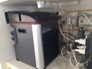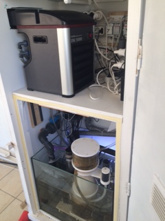 οπως βλέπετε το chiller μπήκε πανω απο το σαμπ . μια 1000 αρα αντλία στέλνει το νερό μάλλον οριακά για να μην κανει φυσαλίδες η επιστροφή. το σύστημα ρουφάει αέρα απο τα δεξια και πετάει τον αέρα στα αριστερά έξω απο το κουβούκλιο. αναμένεται η εγκατάσταση ανεμιστήρων με φίλτρο στα δεξιά για να έρχεται πιο πολύ αεράκι.