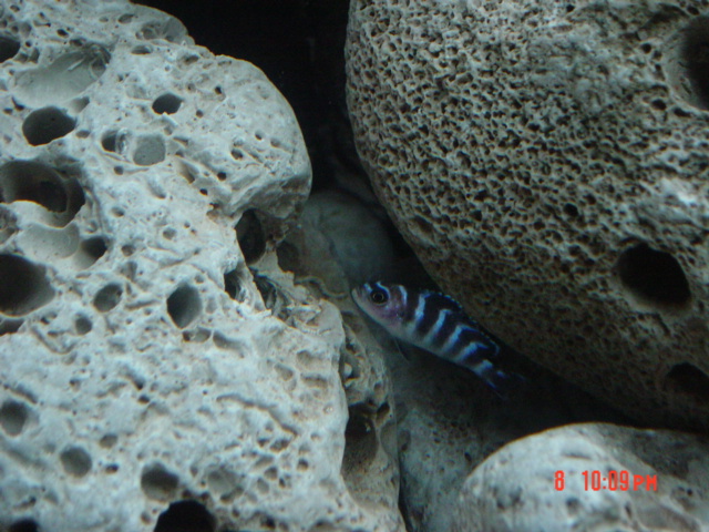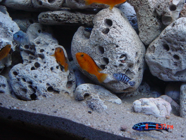 Μετα απο αρκετο κοπο να στηθει ηρθε η ωρα να παρουσιασω την δικια μου προσπαθεια.Το ενυδρειο ειναι απο μπετοφορμ 500 περιπου λιτρων και φιλοξενει mbuna.Πετρες μαζεμενες απο θαλασσα και αμμο ποταμισια.Φιλτρανση με sump 80 λιτρων και αντλια 2500 λιτρων,επισης ενας κυκλοφορητης 500 λιτρων χαμηλα στο ενυδρειο,δυο θερμοστατες 300 watt Ο ενας στους 26 βαθμους και ο αλλος στους 25,φωτισμος 3 λαμπες φθοριου 36 watt εκαστη,η μια ειναι μπλε και αναβει μια ωρα πριν και μια ωρα στο τελος της περιοδου φωτισμου.Στο sump μπηκαν υλικα απο στρωμενο ενυδρειο και δεν χρειαστηκε στρωσιμο.Προς το παρον φιλοξενει 4 LABIDOCHROMIS 4 Melanochromis 2 Maylandia greshakei 1 socolofi(αναζητουντε και αλλα) 1 synodontis, προσωρινα 3 pleco απο το προηγουμενο ενυδρειο.Μερτησεις ph 8-8,2 NO2 0 NO3 ) KH 4 GH >10 <16