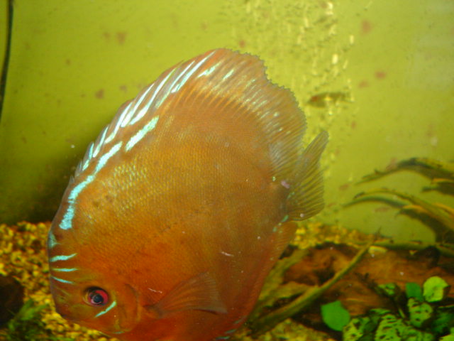 NO3=0 NO2=25-50 (mg/l) GH>10 d KH=0-3 d pH=7+ Για τις μετρήσεις είχα το Tetra test 5in1 και μου έδινε pH=6,8 - 7. Τώρα έχω χωριστό test pH (της Tetra κι αυτό) και μου δίνει 7,5 ή 8! (Μήπως κάνω κάτι λάθος Πρέπει να μειώσω τη GH? Αλλάζω το 10% του νερού ανά εβδομάδα (χρειάζεται περισσότερο Τα ταΐζω με high energy granules της Tetra. Τώρα τα υπόλοιπα ψάρια είναι σε καλή κατάσταση (δεν είχαν αρρωστήσει ποτέ άλλωστε). Η κατάσταση του εν λόγω δίσκου τώρα φαίνεται στην τρίτη φωτό, τρώει κανονικά (ενώ κατά την πρώτη νόσησή του δεν έτρωγε) αλλά είναι λίγο επιθετικός προς τους άλλους δίσκους. |