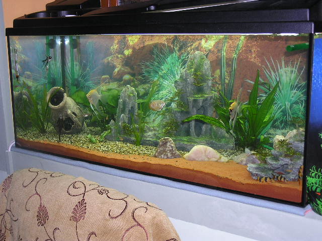 Οι διαστάσεις του ενυδρείου είναι 100 χ 40 χ 40 το οποίο σημαίνει 130 λίτρα καθαρού νερού. Εξοπλισμός: ΦΙΛΤΡΟ: EHEIM 2222 (μπλε σφουγγαρι,ασπρο σφουγγάρι και δυο επίπεδα με κεραμικό υλικό) 500 λίτρα / ώρα ΘΕΡΜΟΣΤΑΤΗΣ: EHEIM 300 WATT ΑΕΡΑΝΤΛΙΑ: EHEIM 400 (δουλεύει μόνο το βράδυ) ΦΩΤΙΣΜΟΣ: 2 Χ 30 watt Μετρήσεις: Αμμωνία: 0 GH: 7 KH: 4 PH: 7 NO2: 0 N03: 8 mg/lt Αλλαγές νερού: 25% κάθε εβδομάδα. Τα ψάρια που έβαλα είναι τα εξής: 3 gourami. 2 Colisa lalia 1 Trichogaster trichopterus 5 κλόουν 5 αγγελόψαρα ( 3 πολύ μικρά και 2 αρκετά μεγαλύτερα) 2 πλατύστομους (δεν ξέρω ακριβός το είδος, μάλλον Hypostomus punctatus - Suckermouth Catfish) 8 μικρά που μοιάζουν με νέον αλλά δεν είναι νέον…. (μικρά, διαφανές, με μια πορτοκαλί φωσφοριζέ λωρίδα κατά μήκος του σώματος) Φυτά: 4 διαφορετικά ήδη, ονόματα δεν ξέρω. Το ένα μόνο είναι ταχείας ανάπτυξης. Αν και καινούριος στο χόμπι, το ενυδρείο από όλες τις απόψεις πιστεύω ότι πηγαίνει αρκετά καλά. Τα προβληματάκια που αντιμετωπίζω είναι τα εξής: