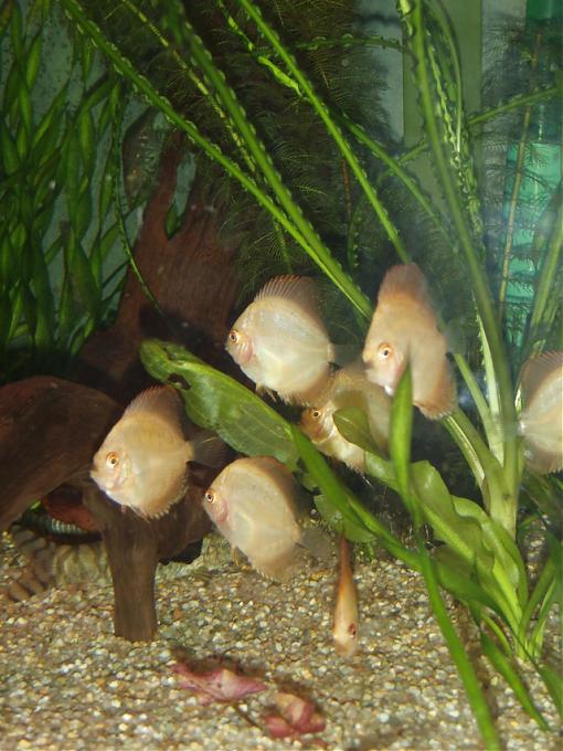 Σας παραθέτω μερικές τελευταίες φωτογραφίες από τα ψάρια όπως ήταν χθες το απόγευμα. Υπενθυμίζω ότι τα ψαράκια αυτά ήταν free swimming στις 24-08-07. Οι πρώτες φωτογραφίες είναι από μία ομάδα έξι ψαριών που έβαλα στο ενυδρείο όπου υπήρχαν αρχικά τα ζευγάρια των δίσκων πριν αρχίσουν την αναπαραγωγή. Τα μεγάλα είναι τώρα μονίμως στις γεννήστρες. Η ανάπτυξή τους δεν συγκρίνετε με αυτήν των υπολοίπων ψαριών που είναι ακόμα σε άλλο ενυδρείο συνδεδεμένο στη σειρά με τις γεννήστρες όπου γίνετε συνεχείς αλλαγή νερού. Οι υπόλοιπες φωτογραφίες καταγράφουν την διαφορά αυτή. Ενώ στα 6 ψαράκια η ανάπτυξη προχωράει με αργότερους ρυθμούς και έχουν και αρκετά μαύρα στίγματα (στις φώτογραφίες φαίνονται και μερικά από spot algea μην μπερδευτείτε, δεν είναι και τόσο πολλά) τα υπόλοιπα ψαράκια έχουν μεγαλώσει περισσότερο και είναι καθαρά χωρίς σχεδόν καθόλου στίγματα. Τα περισσότερα ψαράκια από αυτή την πρώτη γέννα έχουν ήδη μοιραστεί σε διάφορα ενυδρεία δικά μου αλλά και φίλων. Αλλά αρκετά λόγια στις φωτογραφίες τώρα: |