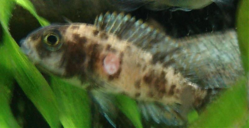 Όντως δείχνει μπουκωμένη,σε κανα 20ήμερο χονδρικά να υπολογίζεις τα μικρά.Το αλάτι είναι μια καλή λύση για τις πληγές,όσο για το γένος μάλλον μιλάμε για aulonocara(δώσε μια καλή φωτο κι απ'τα 4 άτομα).
