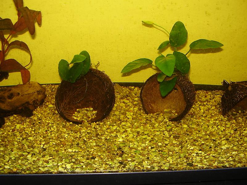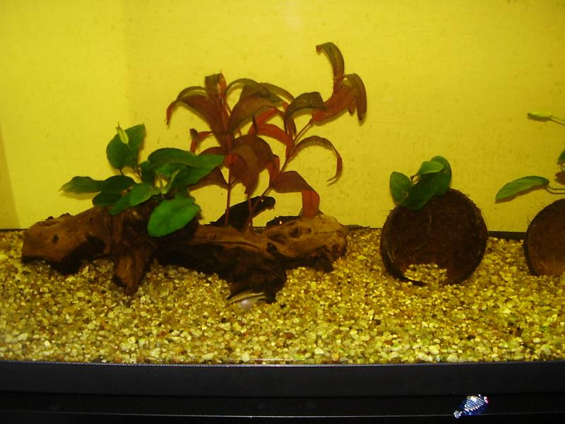 Βάλε περισσότερα φυτά, εύκολα,όπως βαλισνέρια, μικροσόρουμ πτερόπους, κερατόφυλλο κι ότι σ'αρέσει από εύκολα. τις καρύδες έτσι όπως τις έχεις δεν έχουν νόημα, κάνε τους μία τρύπα στο πλάι κ γύρνα τες με τα χείλη στον πάτο για κρυψώνες. θα μπορούσες να προσθέσεις κ καμιά ρίζα ακόμη, πιο μεγάλη. πρέπει να αποφασίσεις τι ψάρια σου αρέσουν, η σύνθεση δεν είναι καλή |