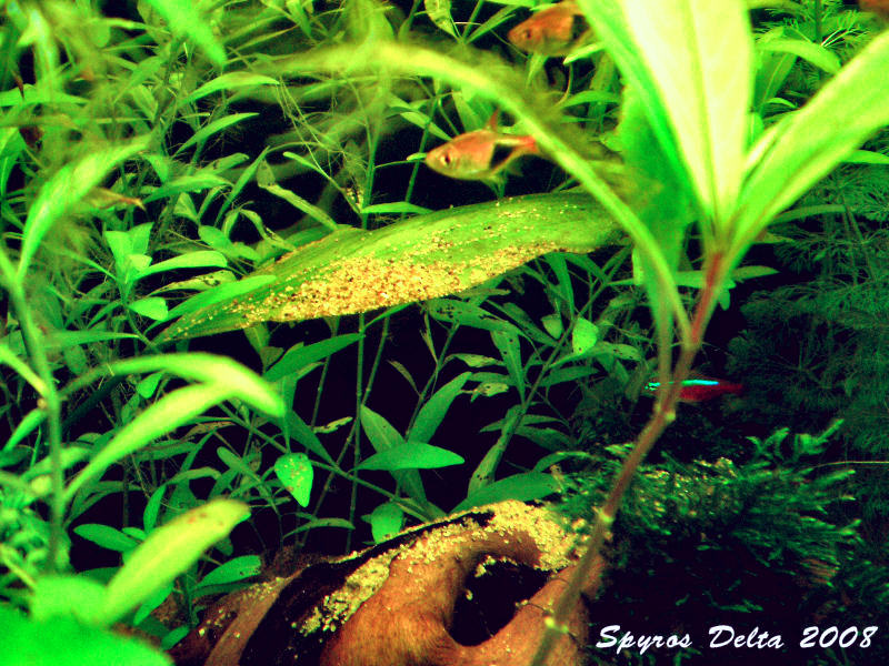 Πλακα κανω, δικια μου χαζομαρα και ατυχια ταυτοχρονα. Ειχε φουλ καλοριφερ το σπιτι (σε συνδιασμο με Τ5 λαμπες) και ανεβηκε η θερμοκρασια σε σημειο που αναψαν τα ανεμιστηρακια (26,5) που τα ειχα ξεχασει ρυθμισμενα απο το καλοκαιρι στον controller.* Παρ'ολο που ημουν διπλα και τα ακουσα, αυτα τα λιγα δευτερολεπτα που δουλεψαν ηταν αρκετα να του σκορπισουν τη φωλια. Μου εριξε τα μπινελικια του, μαζεψε οτι μπορουσε, αλλα σημερα ειδα οτι εχει χτισει καινουρια μεγαλη φωλια για νεες "περιπετειες" με τη θηλυκια. Πολυ ενδιαφερουσα και περιεργη συμπεριφορα ειναι αυτη που θα παραθεσω, και θα ηθελα να μου πει καποιος αν την εχει ξαναδει σε καποιο ψαρι (ειτε gourami ειτε αλλο λαβυρινθοψαρο). - Ταυτοχρονα με το χτισιμο της φωλιας στην επιφανεια, ο αρσενικος περισσοτερο αλλα και τα θηλυκα, επαιρναν αμμο απο το βυθο και ραντιζαν με αυτη το χωρο κατω απο τη φωλια (φυτα και ξυλα). (φωτο στο τελος) Δεν καταλαβαινα τι σκοπο ειχε ακριβως αλλα μετα τη γεννα καταλαβα. Αφου γεννησαν και ο αρσενικος κολλησε τα αυγα επανω στην φωλια, διελυσε οση φωλια περισσευε εκτος απο το σημειο που ηταν μαζεμενα τα αυγα. Μετα πηγε και σκουντησε με το πλαι του σωματος του ενα φυλλο που ειχε επανω αμμο και επεσε λιγη αμμος προς τα κατω. Την ωρα που επεφτε η μικρη "βροχη" τα τετρας ετρεξαν να παρουν μεζε νομιζωντας οτι ειναι αυγα (η αμμος του ενυδρειου μοιαζει πολυ σε χρωμα και μεγεθος με τα αυγα). Ο αρσενικος ετρεξε και τα κυνηγησε αγρια και τα τετρας του αδειασαν τη γωνια. Αυτο επαναληφθηκε μερικες φορες παλι. Μετα αρχισε ο αρσενικος, καθε λιγο να αεριζει τη φωλια με μια κινηση του σωματος του και των πτερυγιων και να αλλαζει θεση στα αυγα με το στομα. Αυτο ειχε σαν αποτελεσμα μερικα αυγα να ξεκολανε και να πεφτουν. Τα τετρας δεν πλησιασαν καθολου. Νομιζω λοιπον οτι ολα ειχαν σκοπο το να κανει τα τετρας να μη ρισκαρουν να φανε φαπα για λιγη "αμμο". Απιστευτο. * η κατωτερη θερμοκρασια ρυθμιζεται με eliwell controller και αυτην εποχη ειναι στους 25,7 (την ημερα με τις λαμπες ανεβαινει στου 26,2) με σκοπο να φτασει το φεβρουαριο του 25. Το καλοκαιρι το ειχα στους 27,8 ανωτερη.